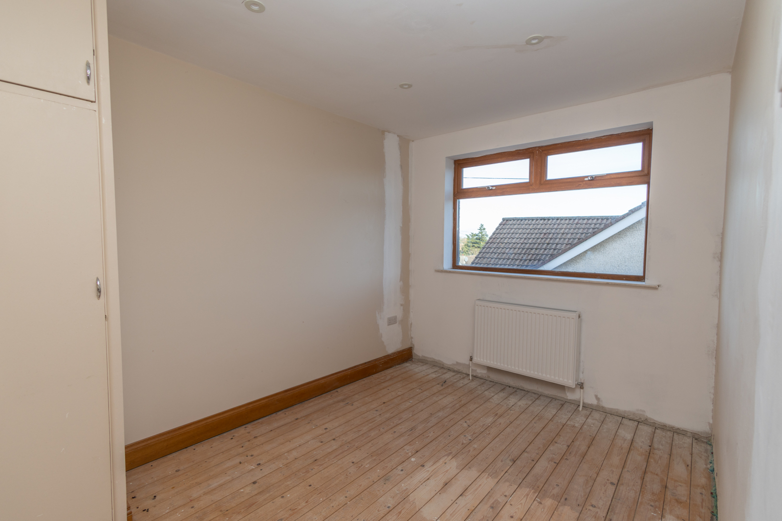 Featuring wooden laths left in place for a purchaser to install their own floor covering. Double radiator. Storage cupboard.