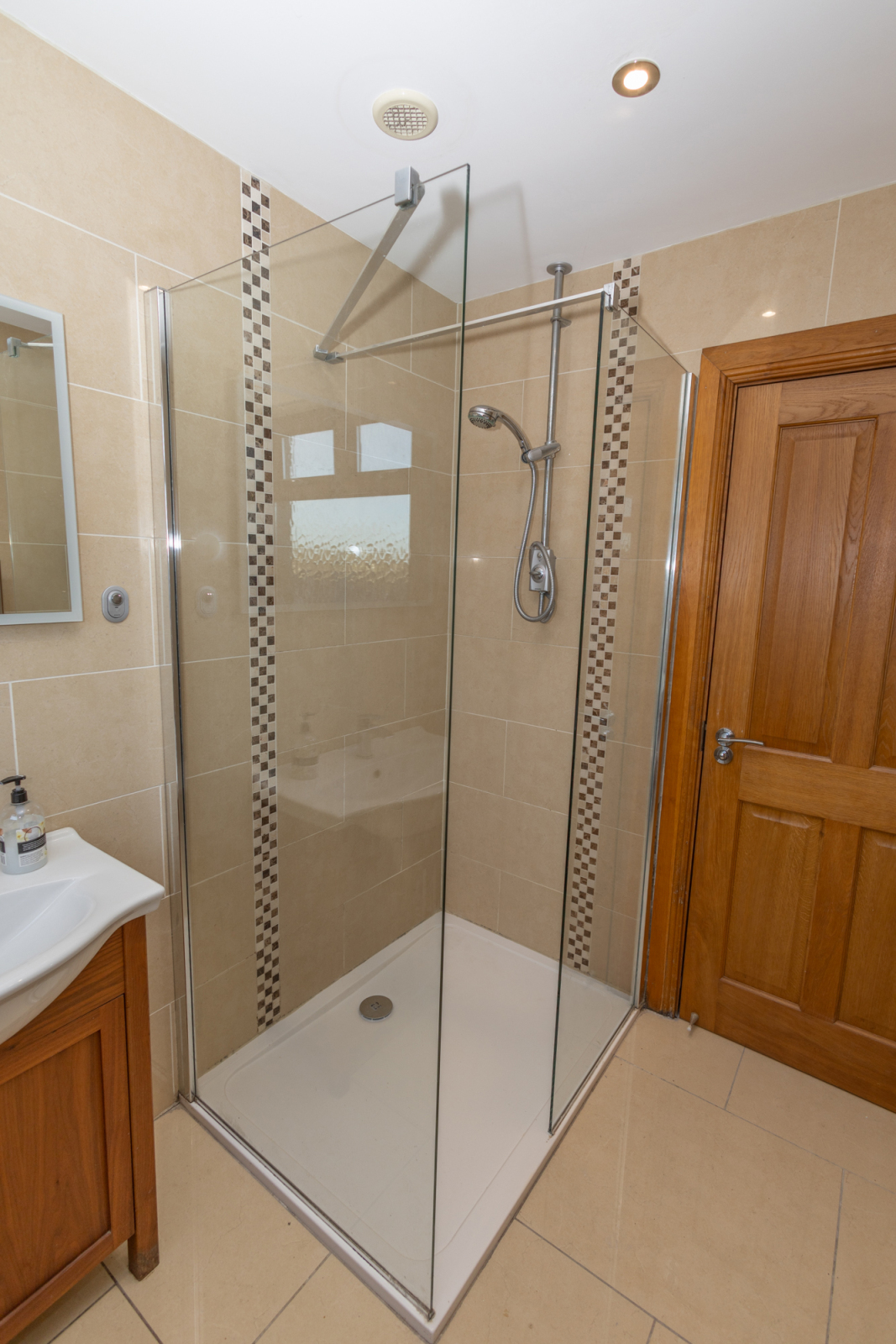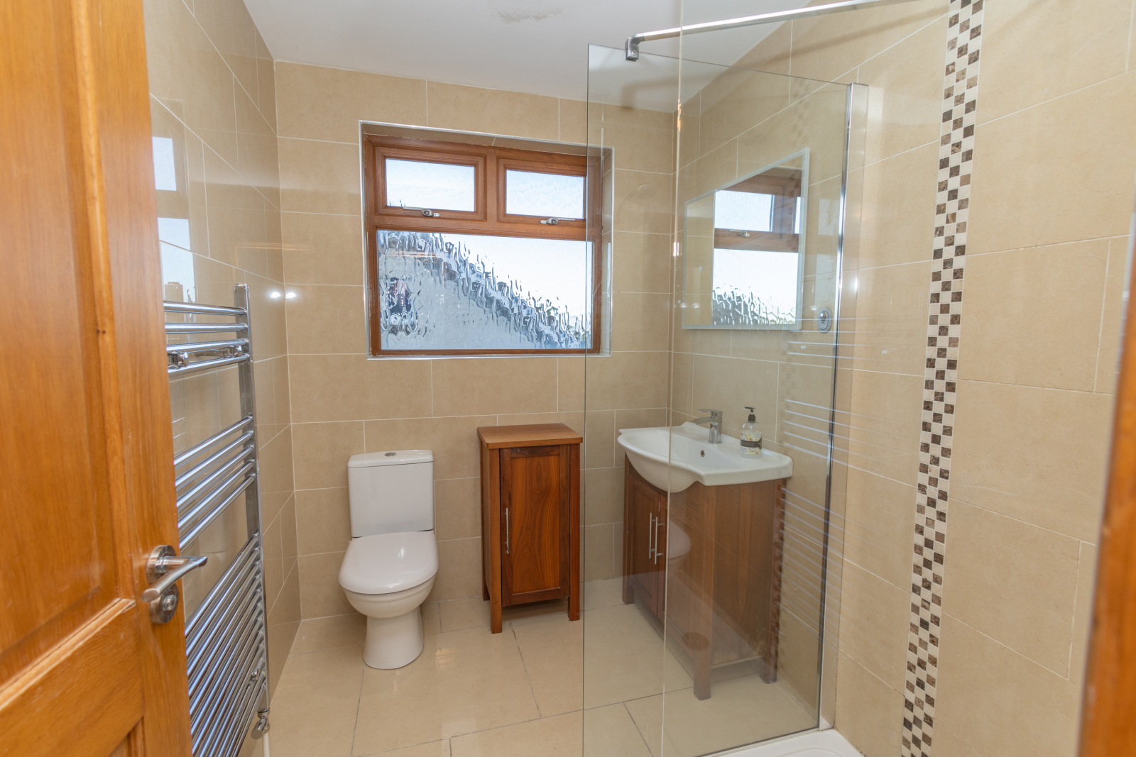Bathroom with fully tiled walls and floor, white suite with WC and wash hand basin, vanity unit beneath, and an LED wall-mounted mirror above. Includes a built-in storage unit, heated towel rail, and a corner electric shower with glass surround.