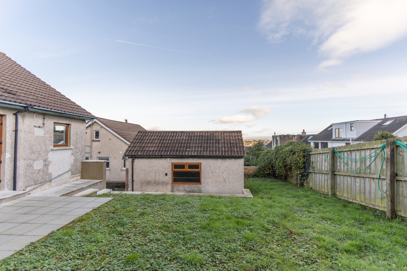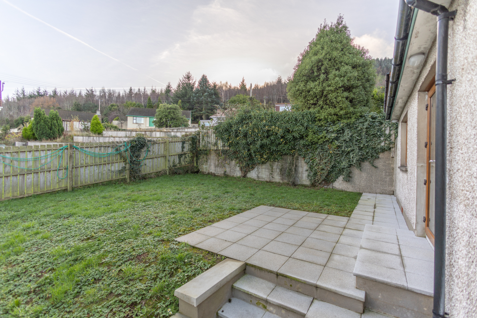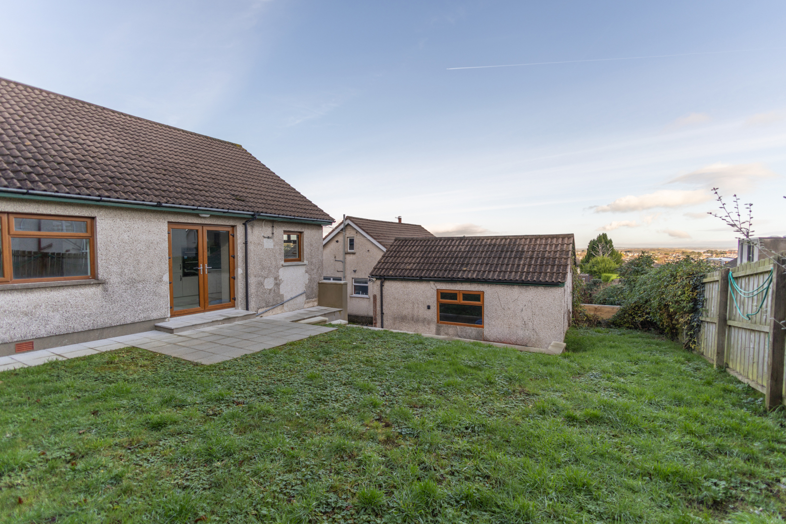 Rear: Newly flagged patio area and steps, with rear garden laid in lawn, south-east facing.