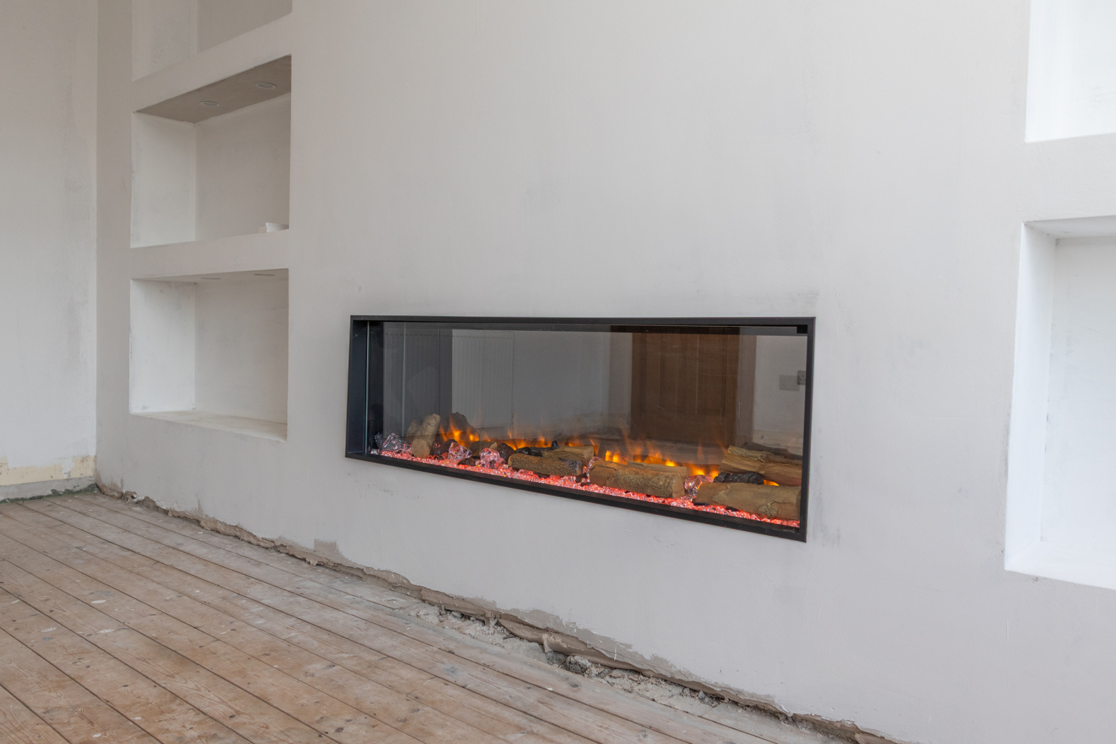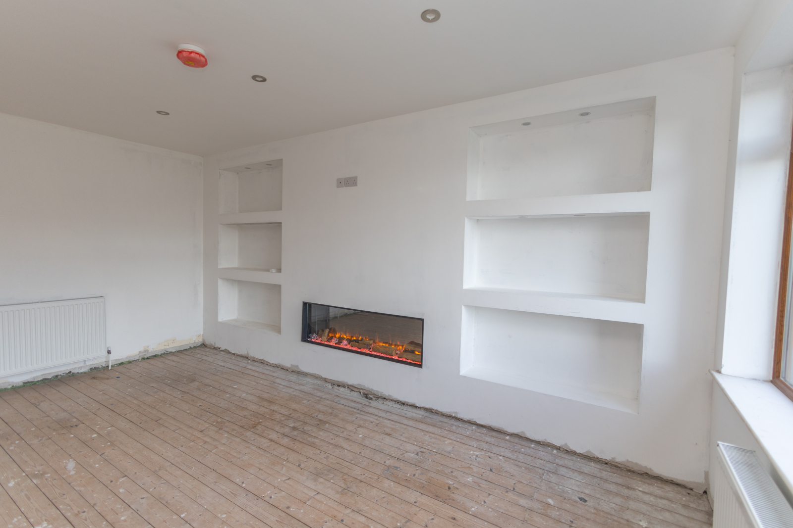 Living Room with wooden laths left in place for a purchaser to install their own floor covering. Newly built media wall, TV point, electric insert fire, and double radiator.
