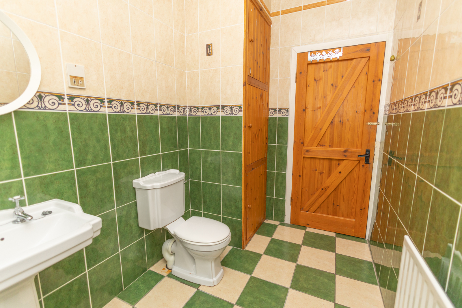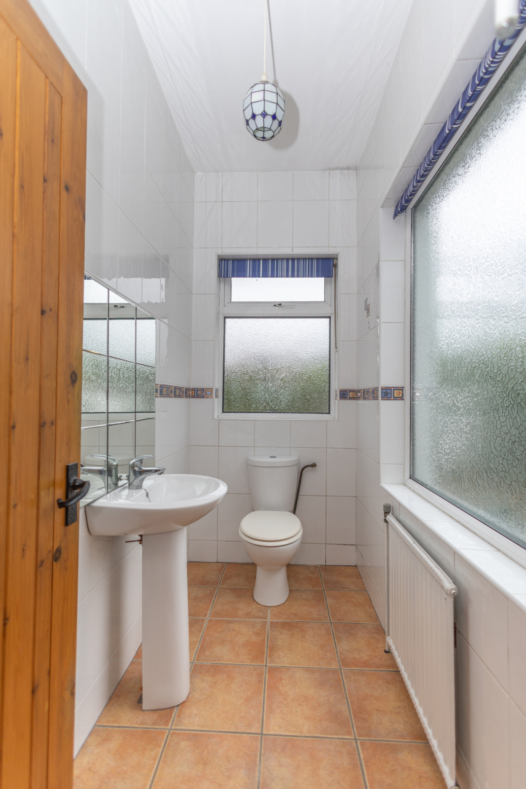 WC with fully tiled walls and floor, white suite with WC and wash hand basin, two windows, and a single radiator, providing excellent natural light.