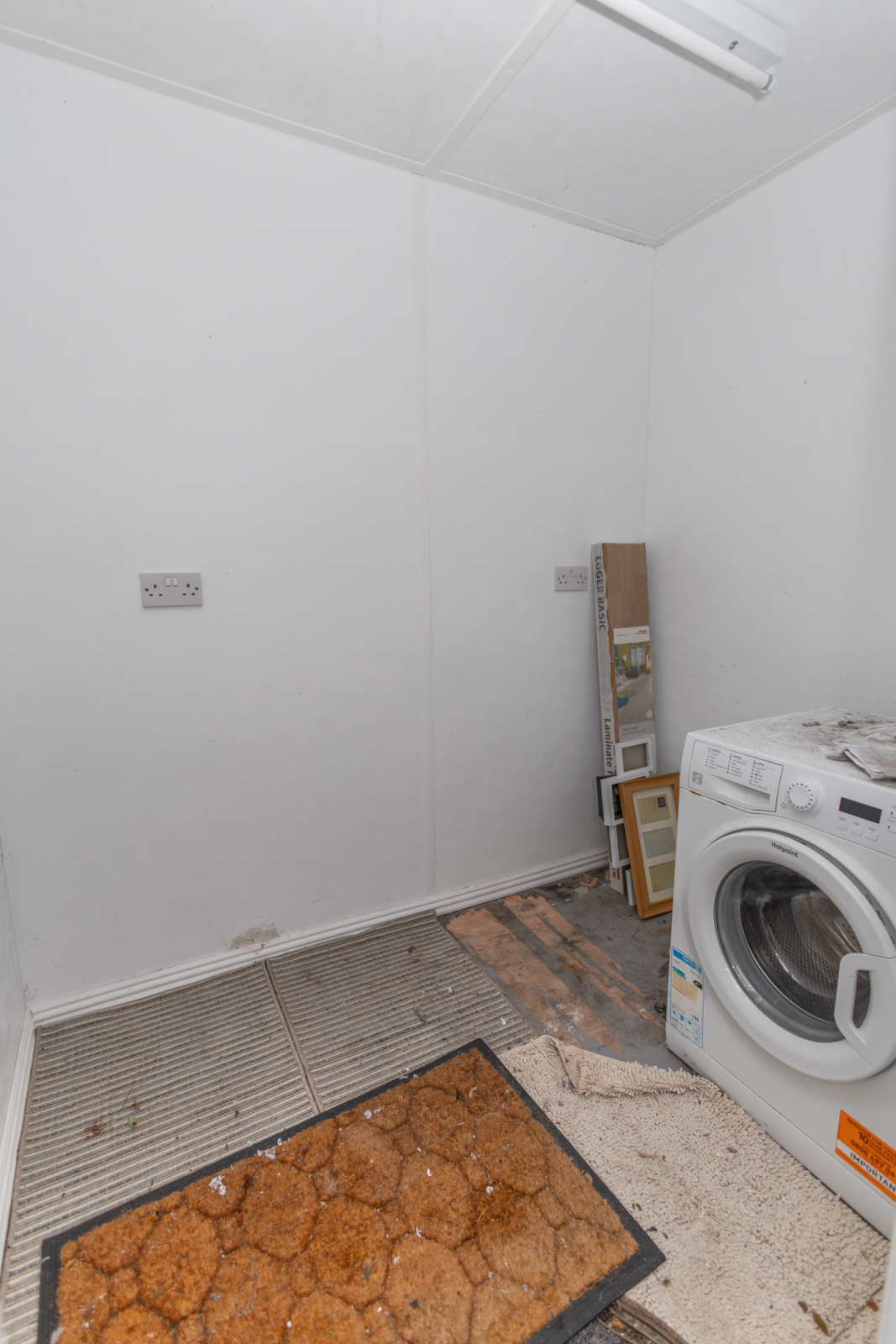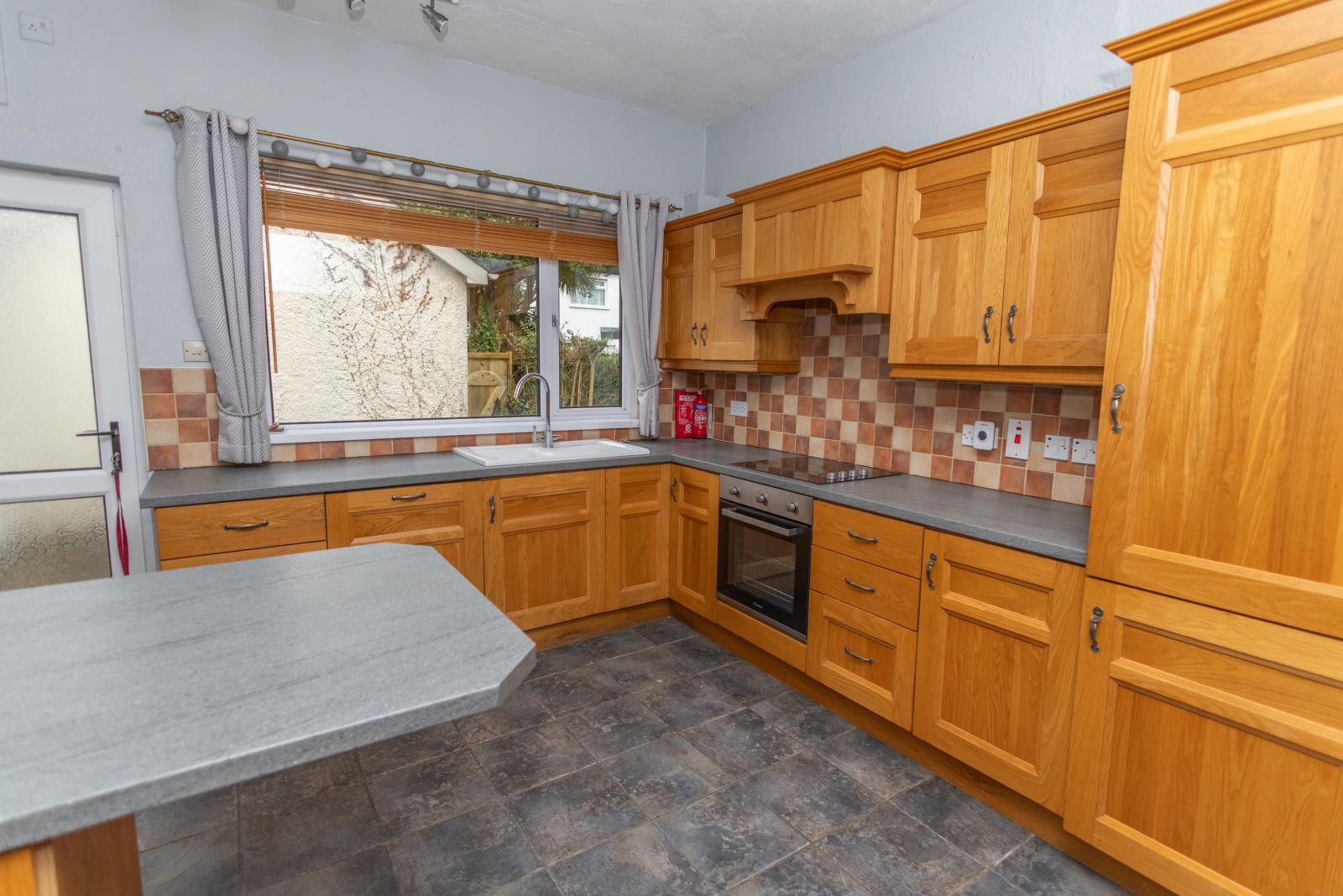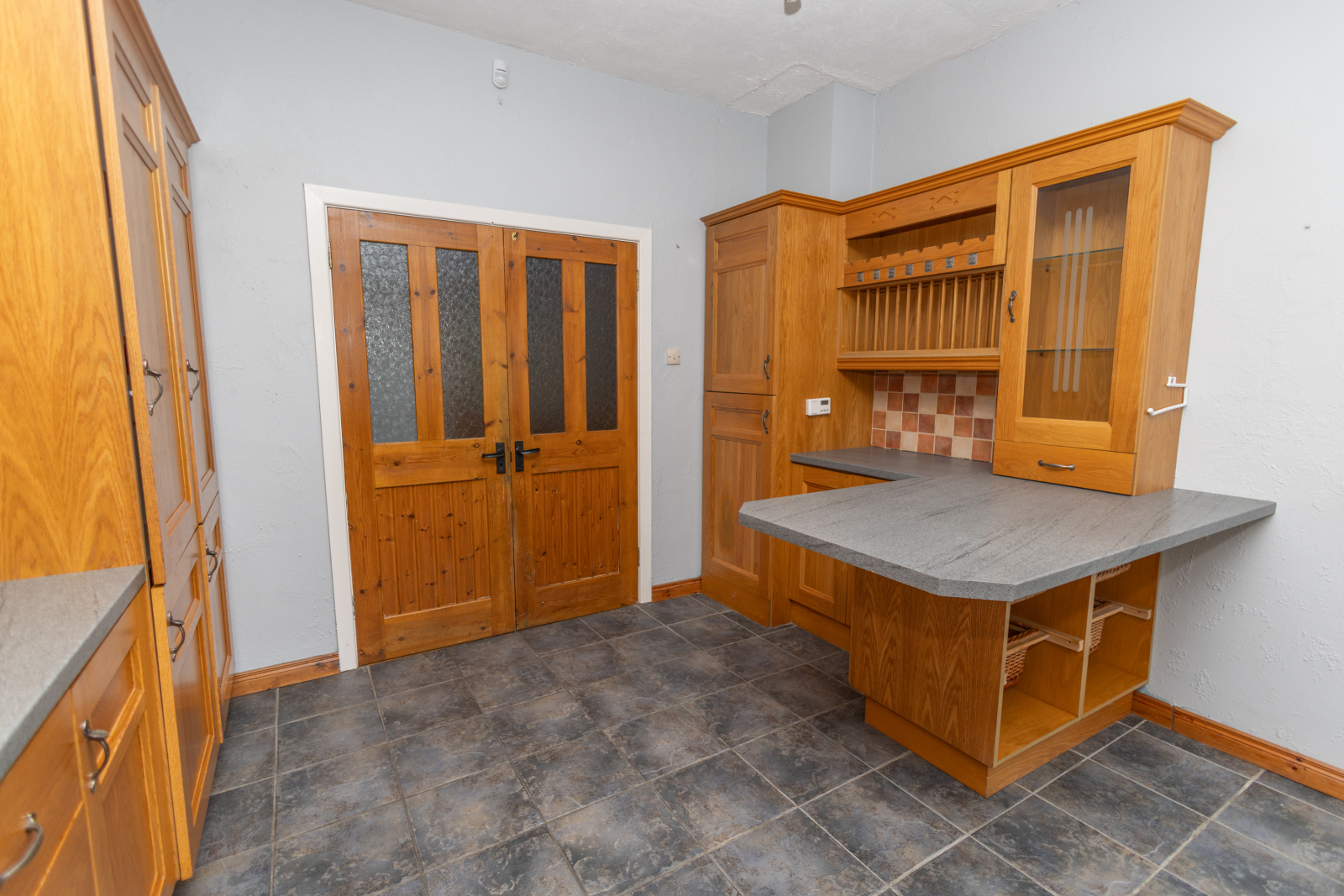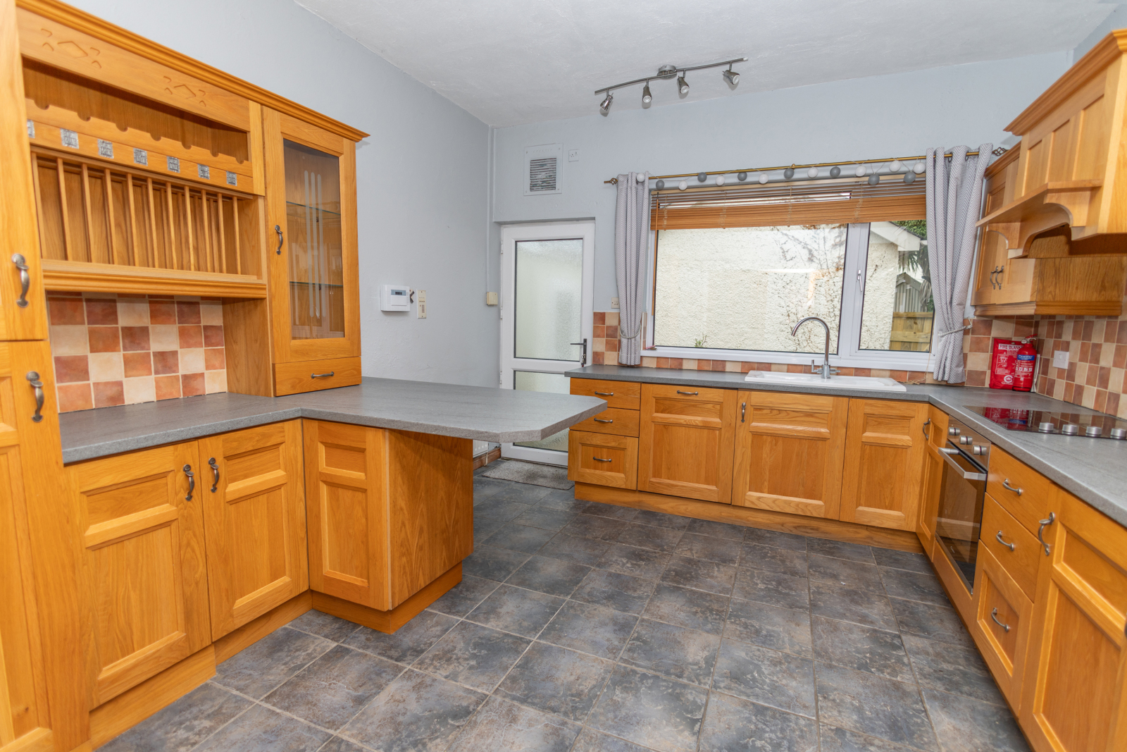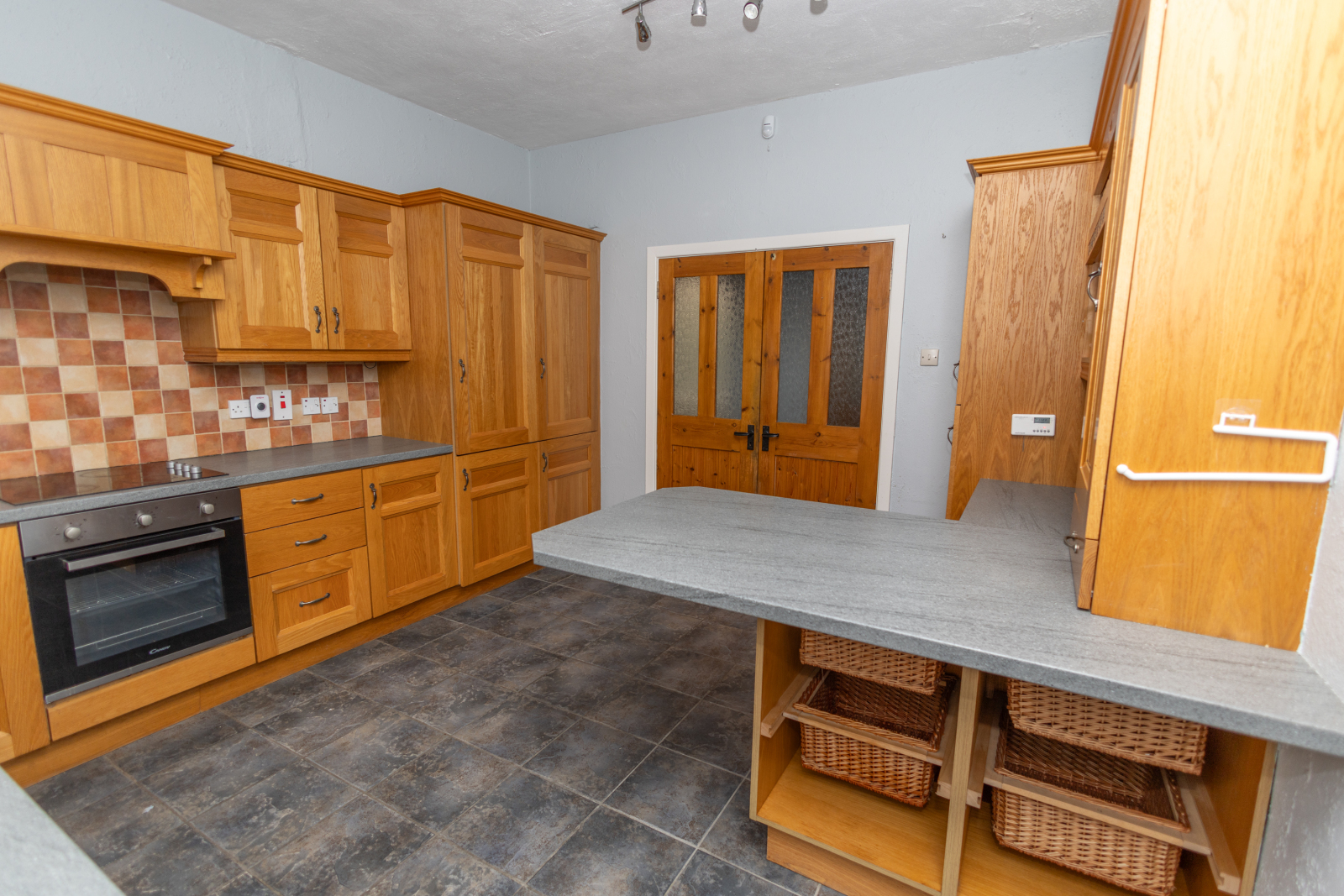 Kitchen / Dining with tiled flooring and solid wood kitchen featuring upper and lower units, tiled splashback. Includes integrated fridge freezer, dishwasher, electric hob and oven with extractor hood above. Back door leads to the side area and utility storage (plumbed for a washing machine).
