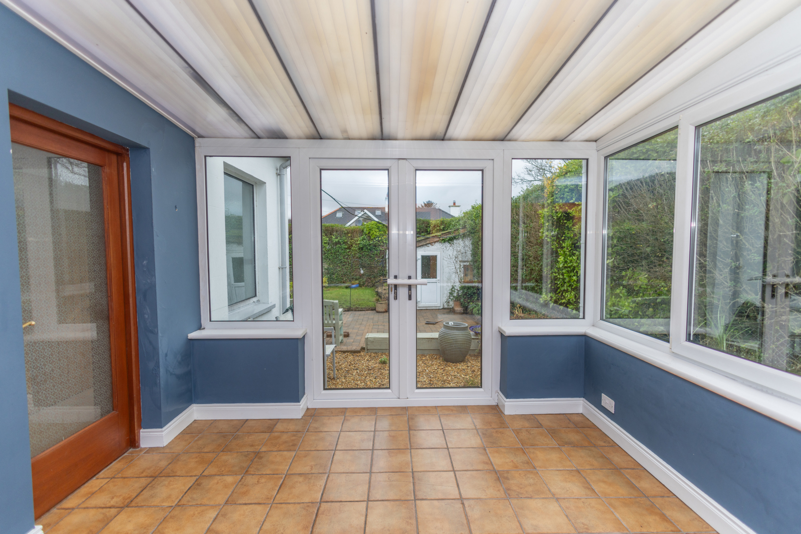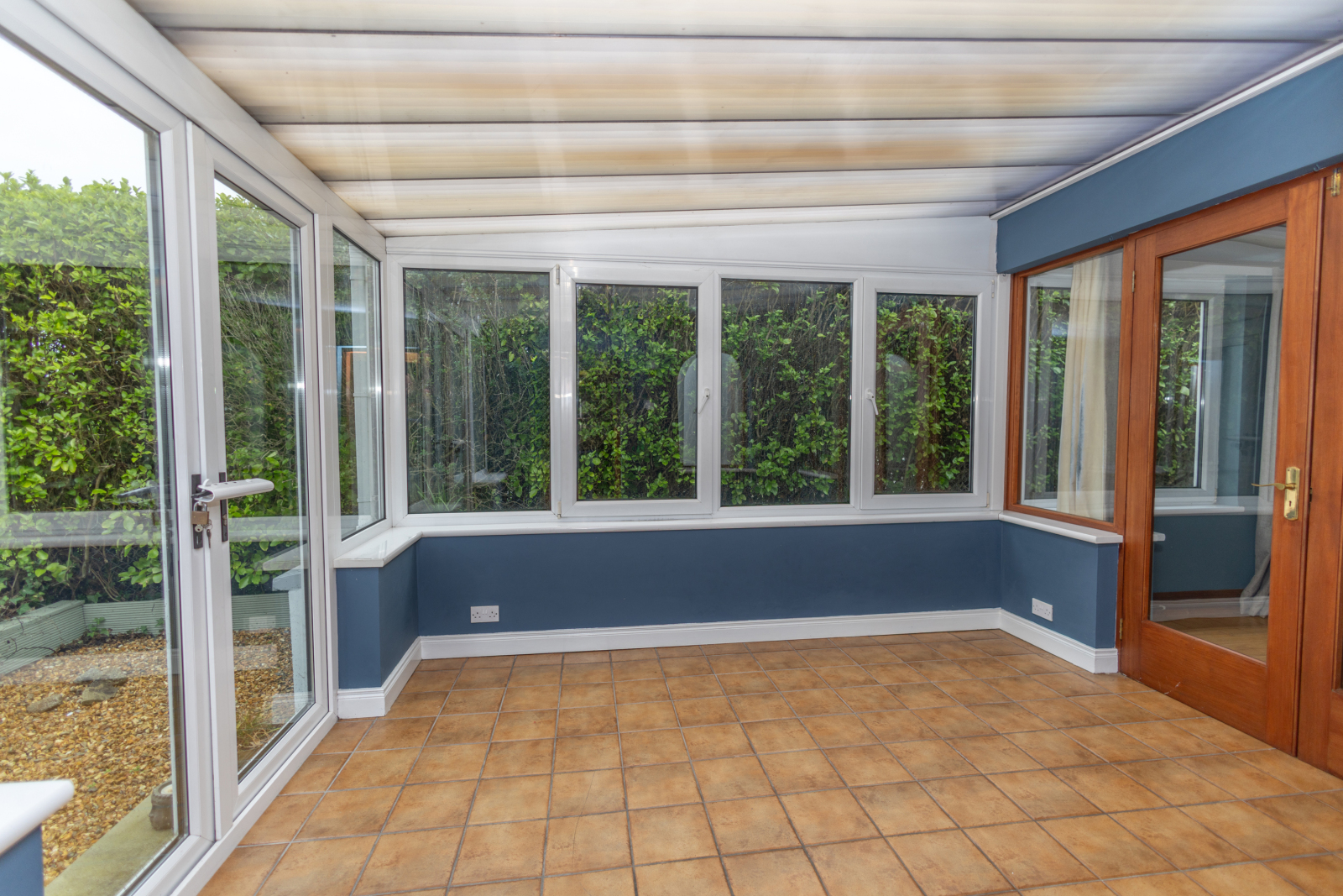 Conservatory with tiled flooring, double patio doors to the rear garden and stone-paved patio area.