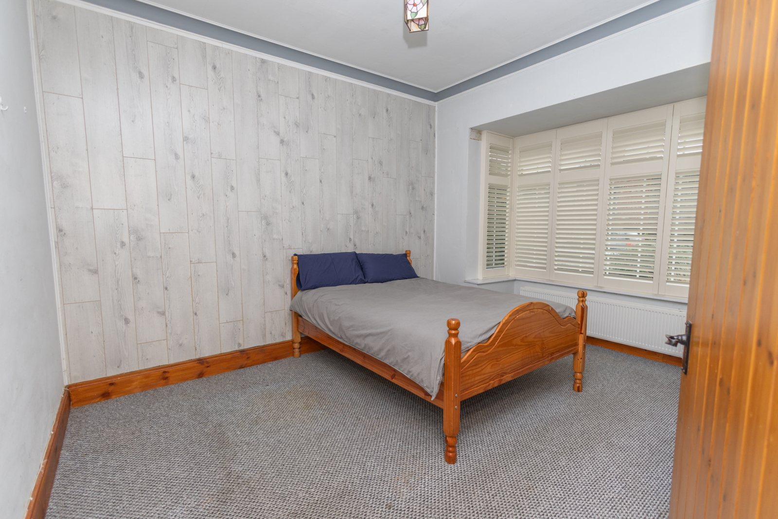 Bedroom Three with carpet flooring, front bay window fitted with shutter blinds and double radiator.