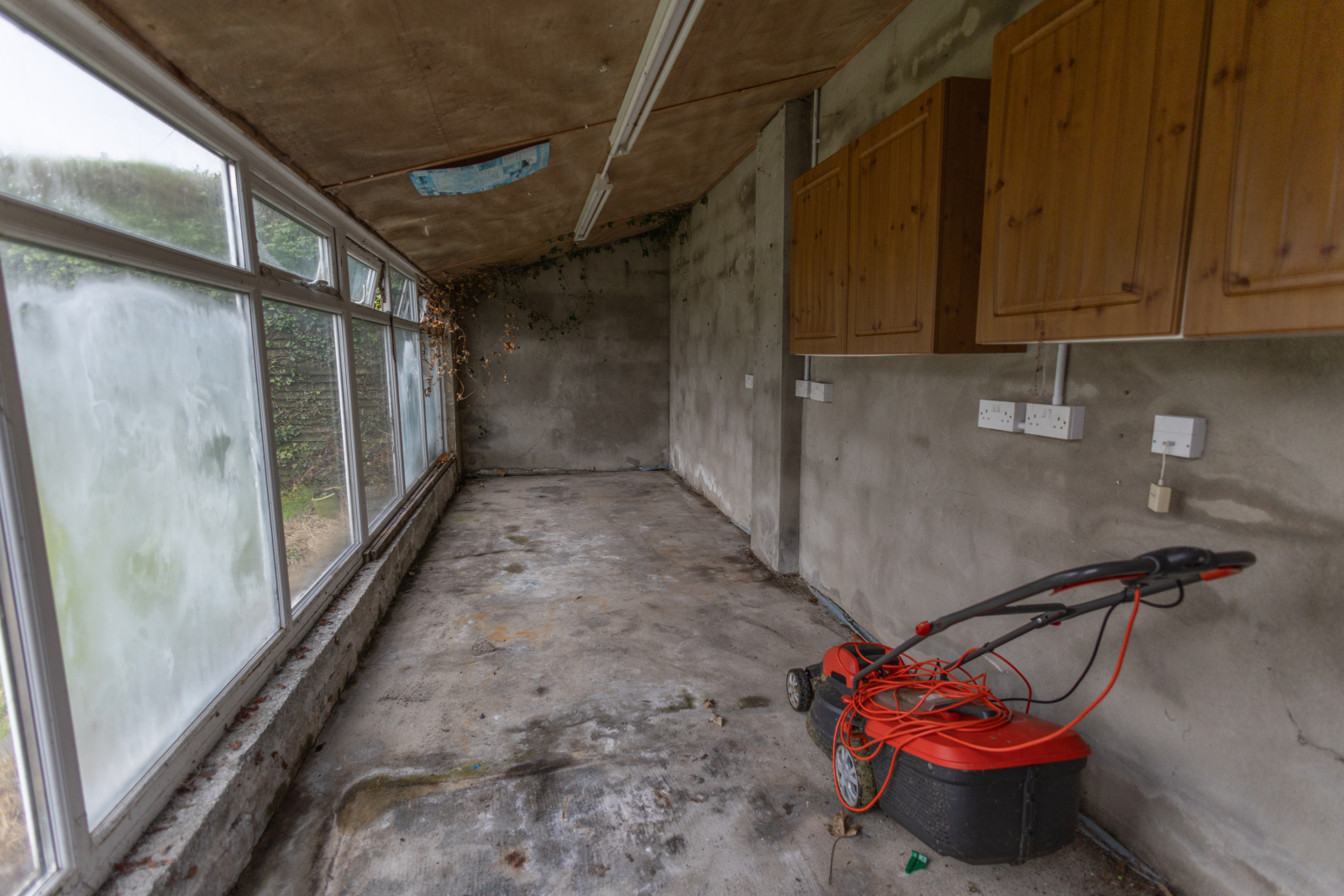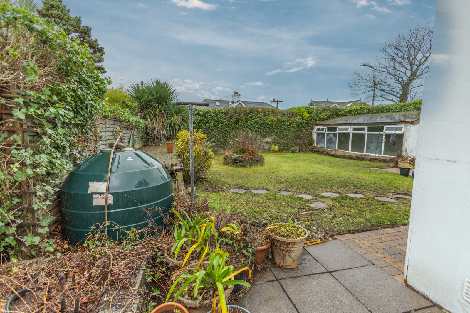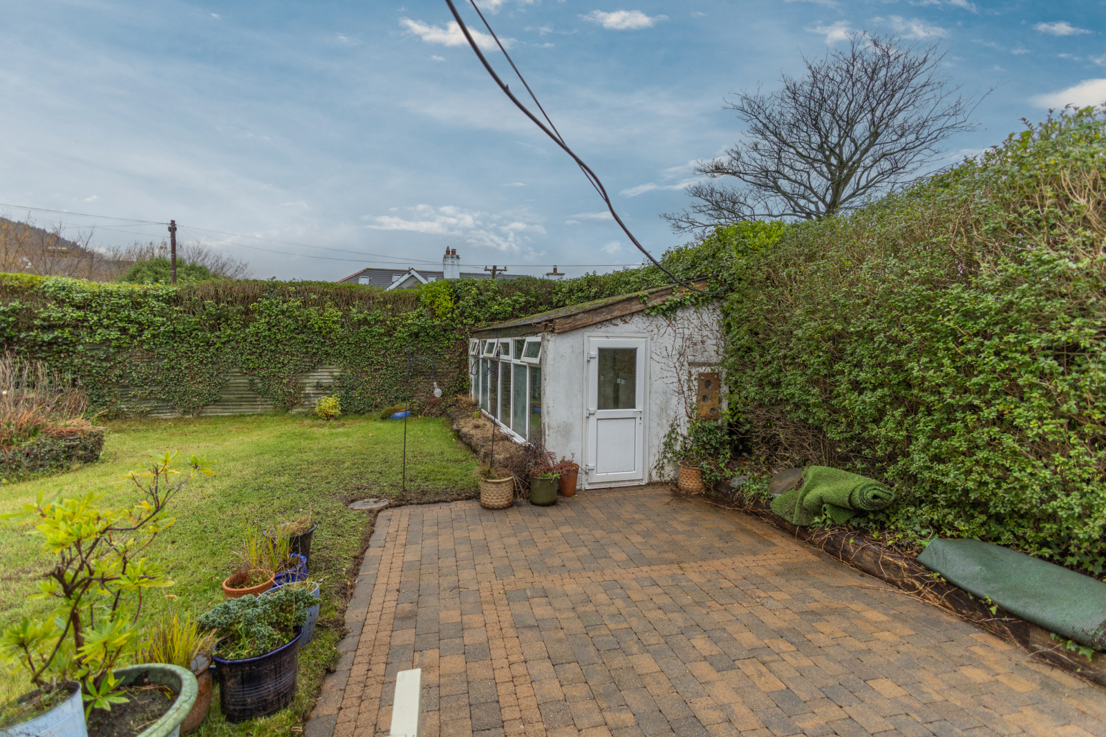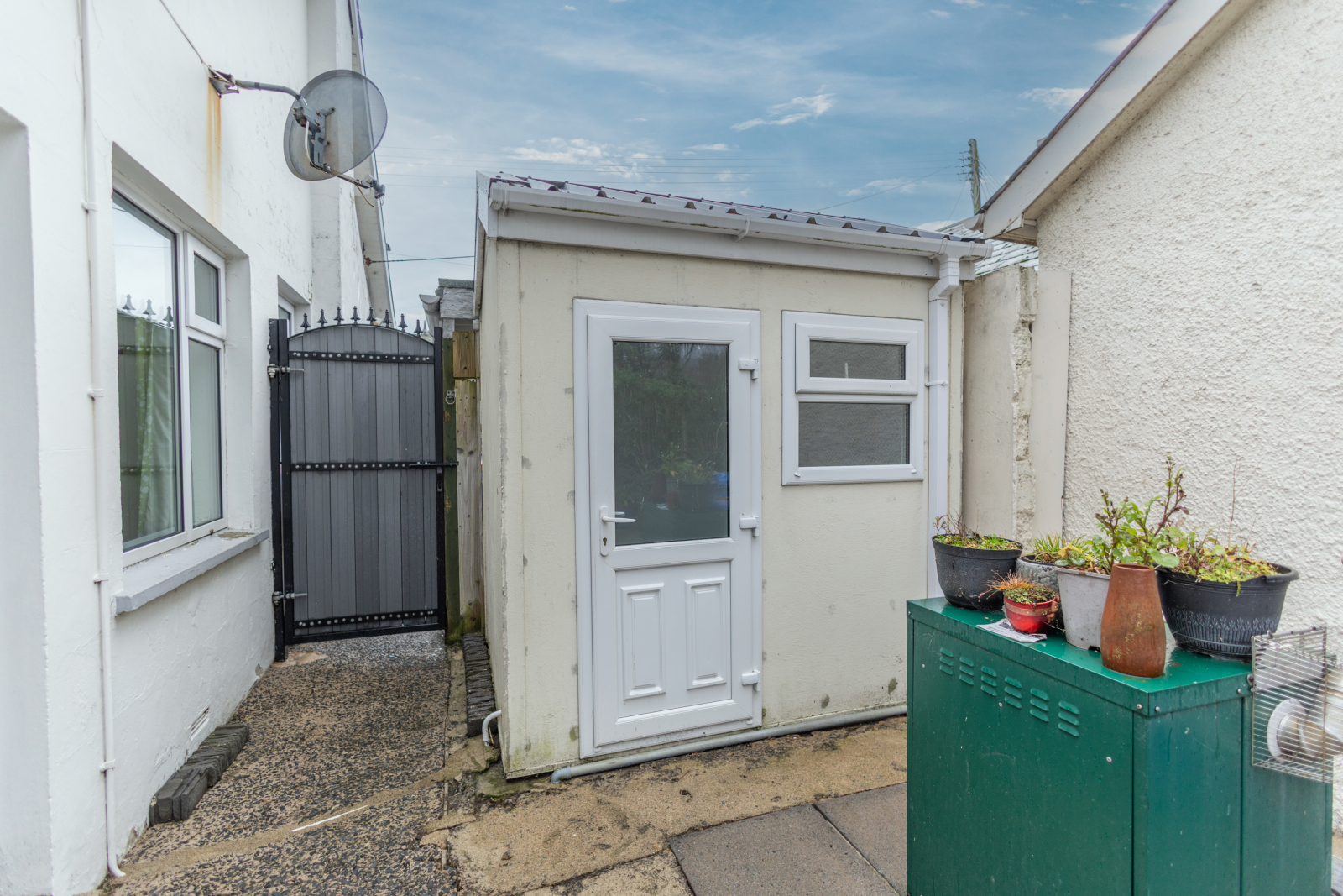 Exterior with rear garden laid in lawn and a storage unit with electricity. The front benefits from off-street parking and a small mature garden.