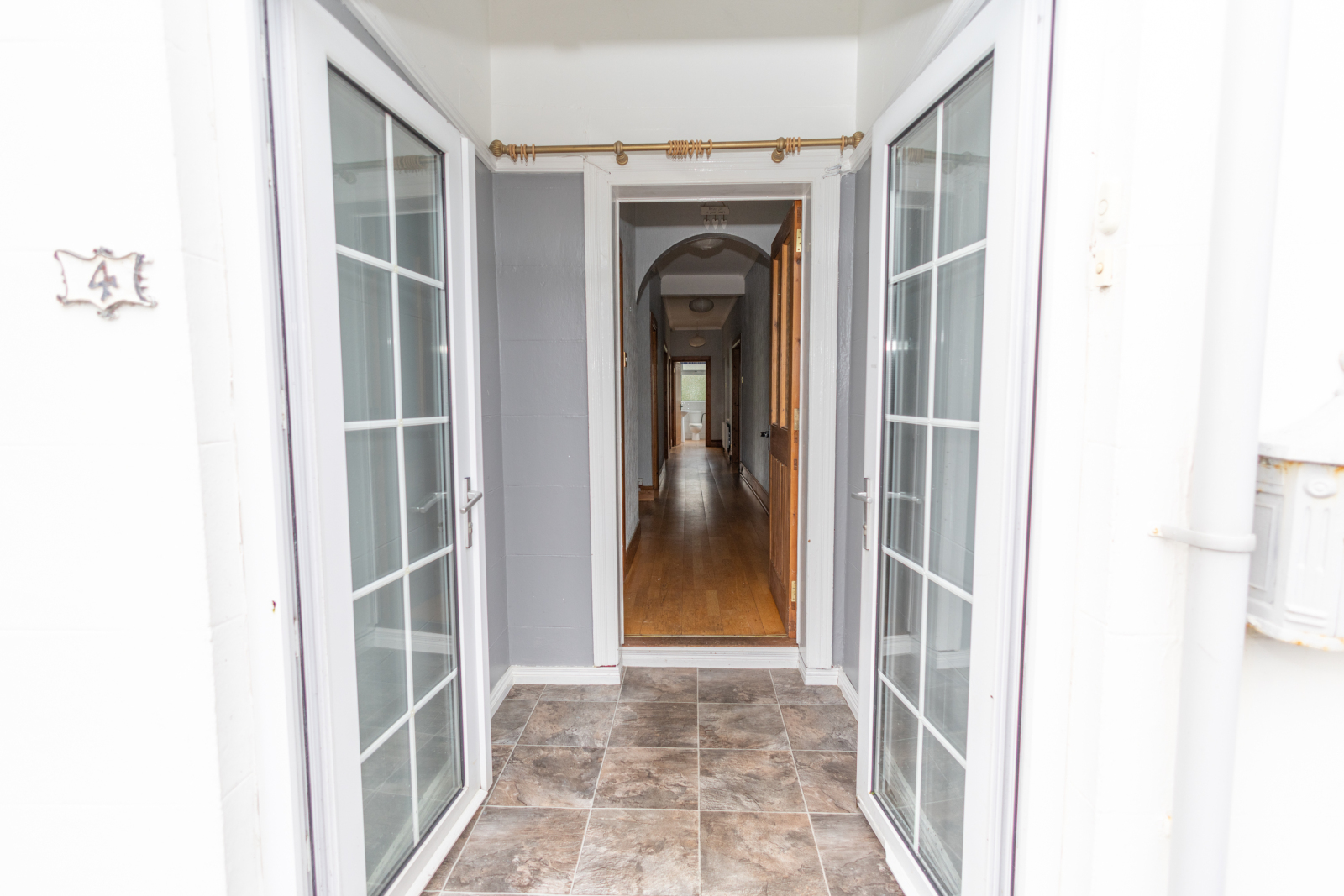 Entrance Porch with patio front doors, vinyl tiled flooring, leading to the entrance hall.