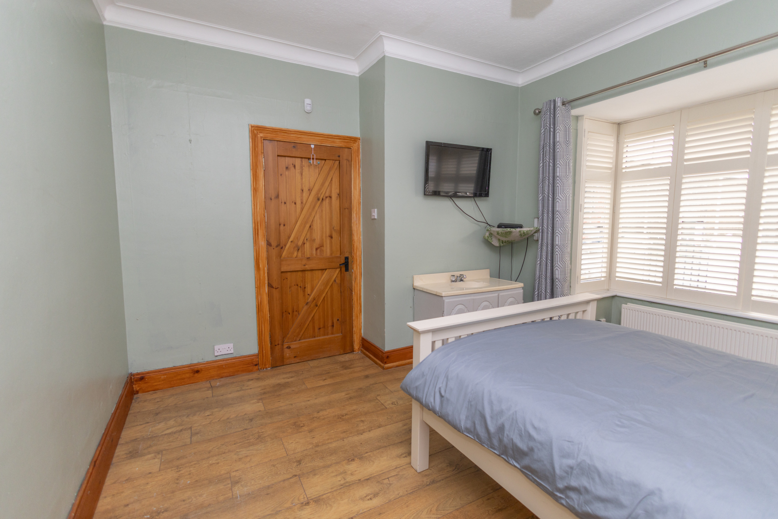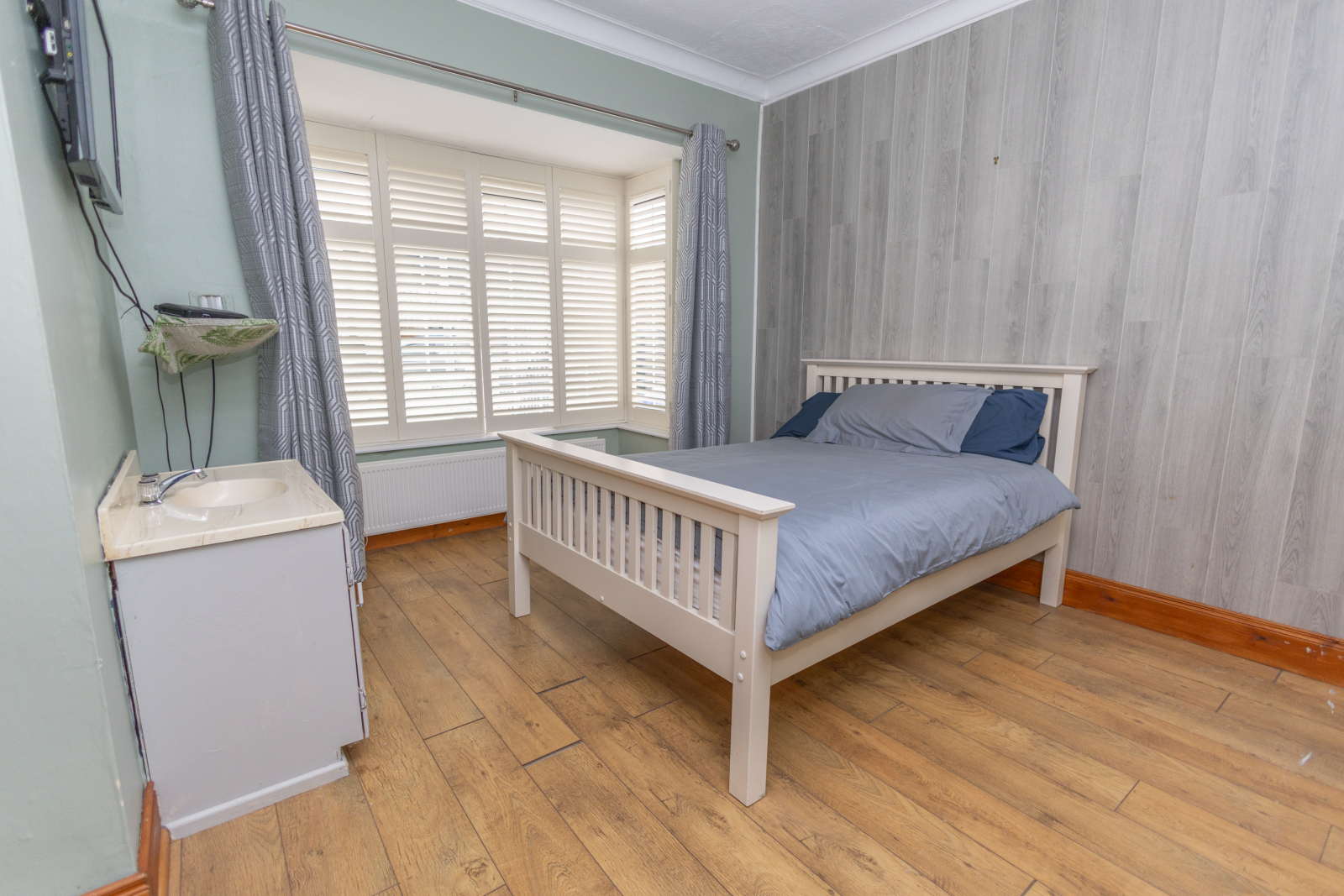 Bedroom Two with laminate flooring, front bay window fitted with shutter blinds, sink, and TV point.