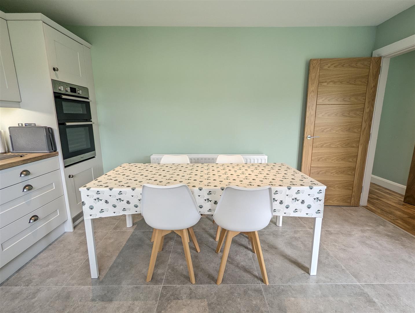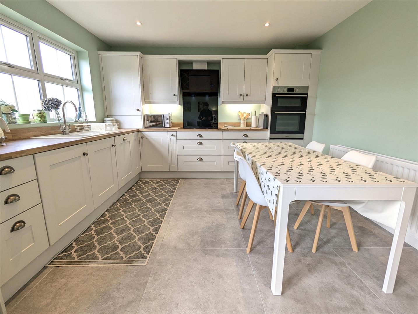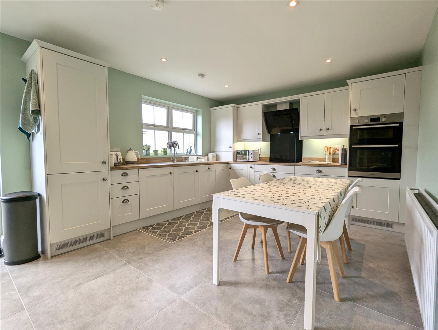Spacious kitchen and dining area overlooking the private rear garden, light grey porcelain tiled floor, modern paint colours and recessed spot lighting. Further features include butcher block effect counters and a range of light coloured shaker style units with traditional knobs and handles. Integrated appliances include a fridge freezer, washing machine, Blanco 1.5 bowl with a stylish dual lever mixer tap, Hotpoint induction hob with modern extractor fan overhead, Hotpoint Double Oven