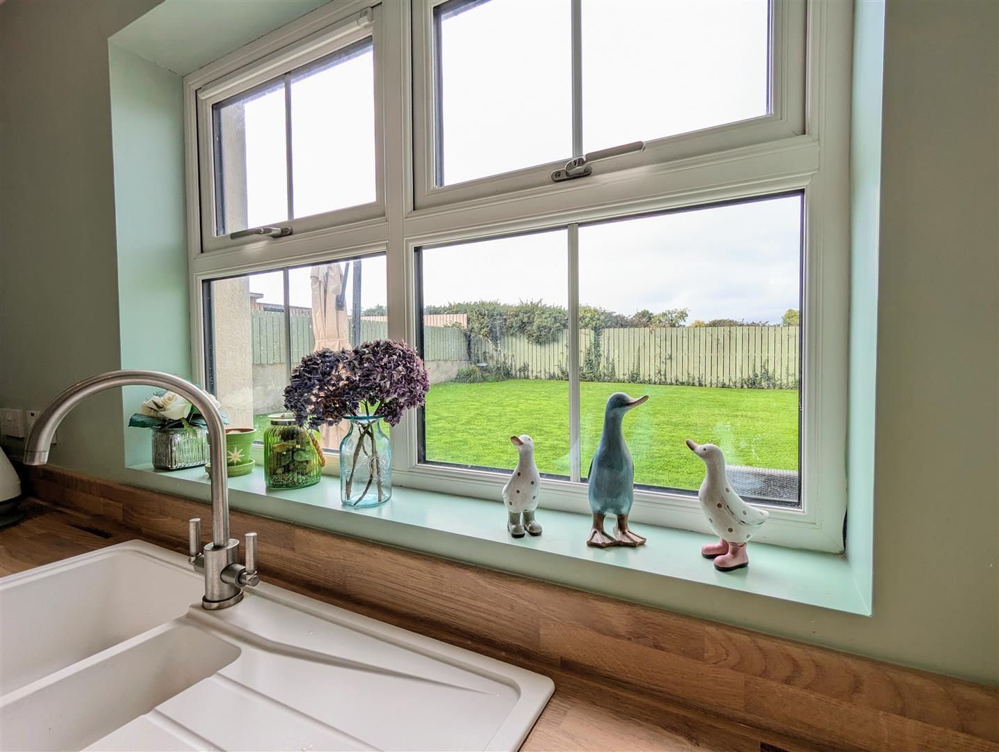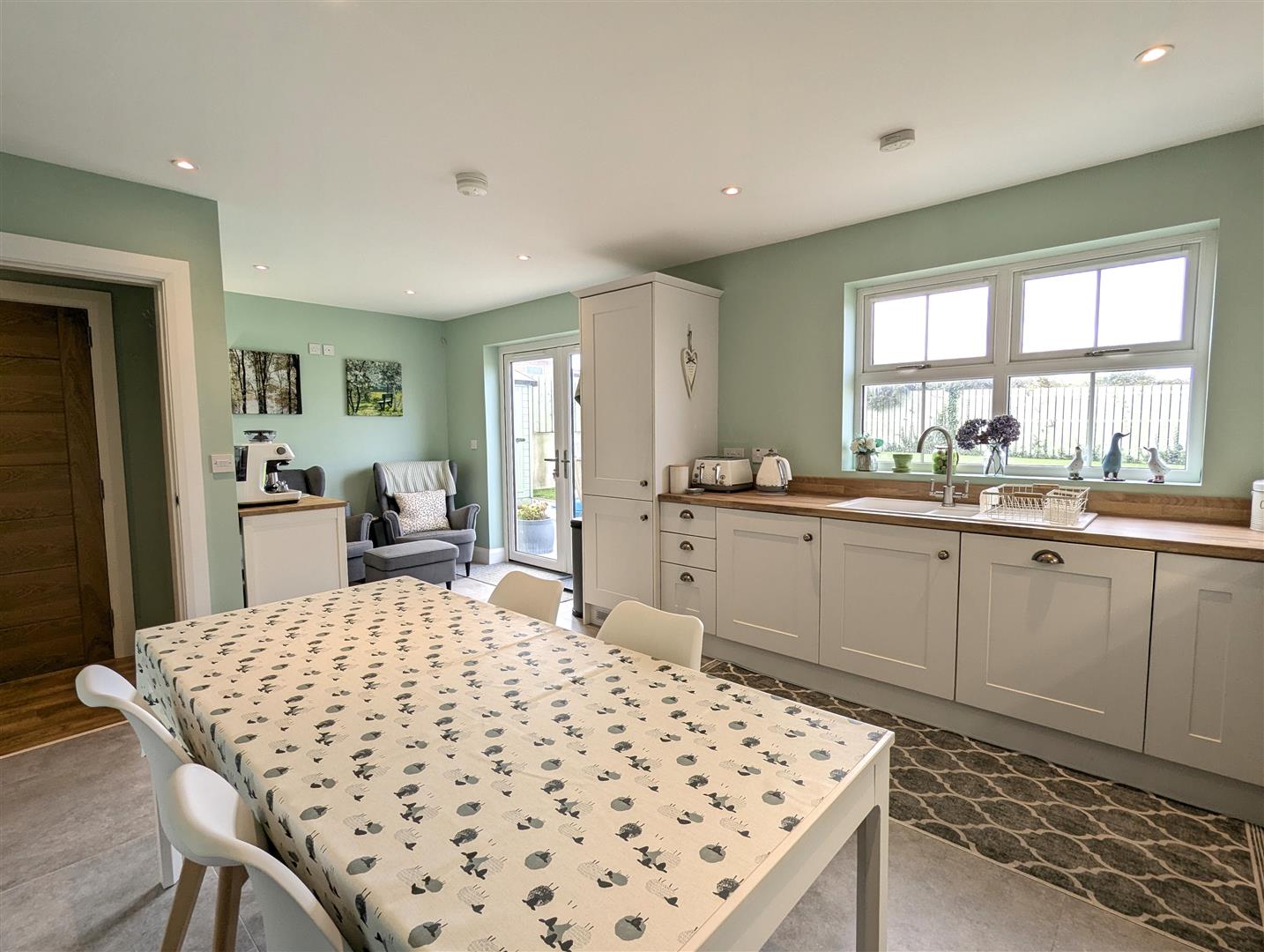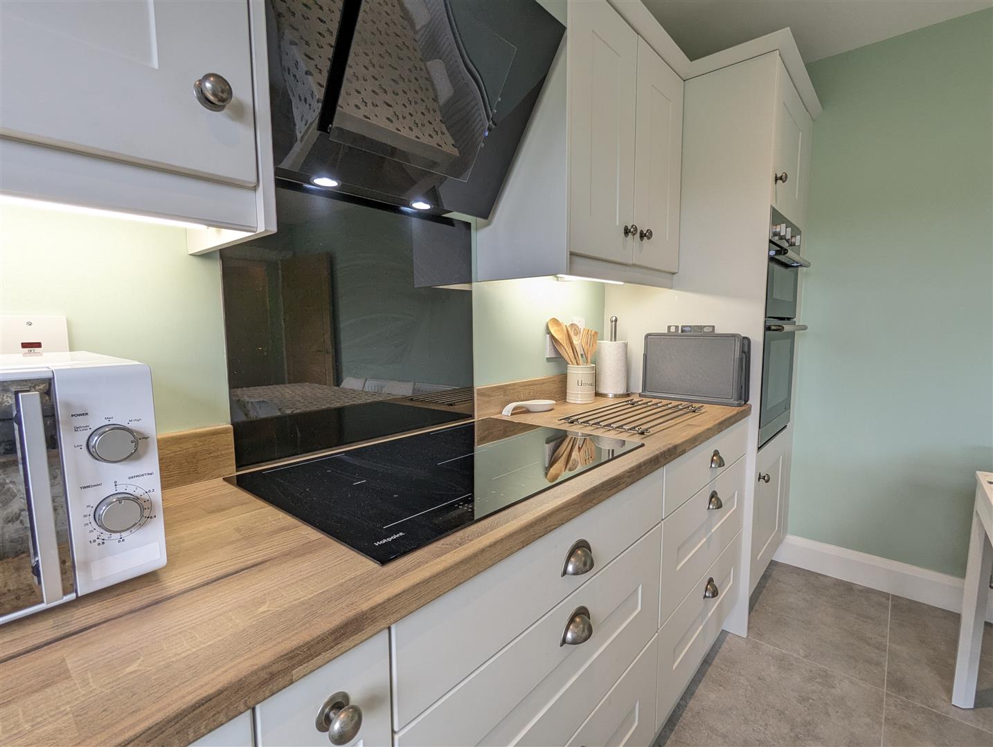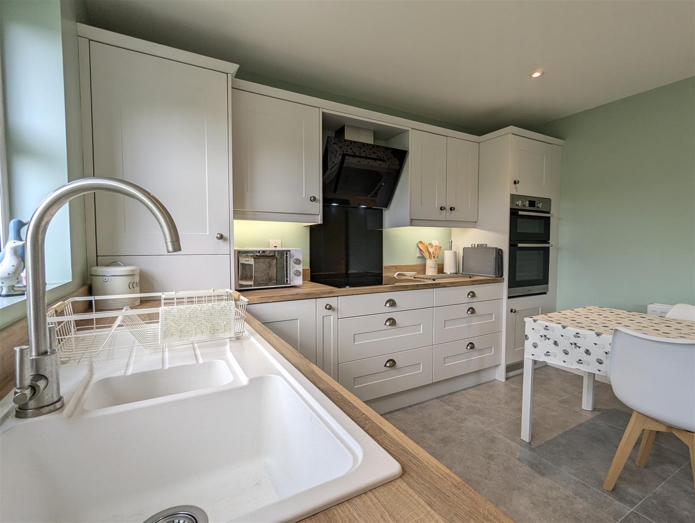 Spacious kitchen and dining area overlooking the private rear garden, light grey porcelain tiled floor, modern paint colours and recessed spot lighting. Further features include butcher block effect counters and a range of light coloured shaker style units with traditional knobs and handles. Integrated appliances include a fridge freezer, washing machine, Blanco 1.5 bowl with a stylish dual lever mixer tap, Hotpoint induction hob with modern extractor fan overhead, Hotpoint Double Oven