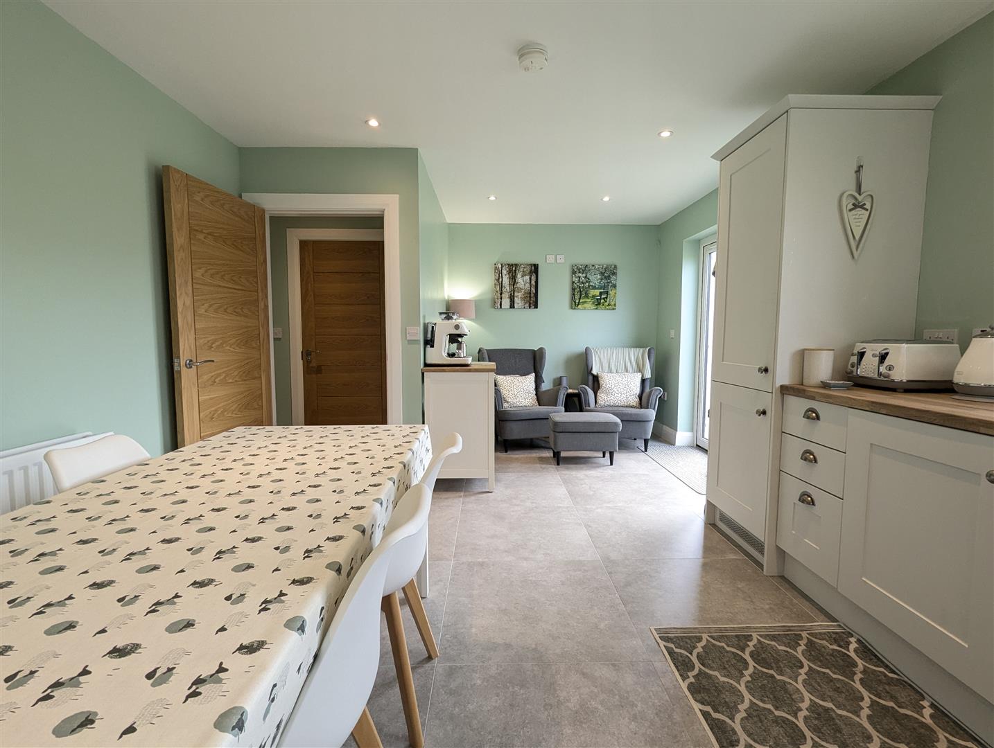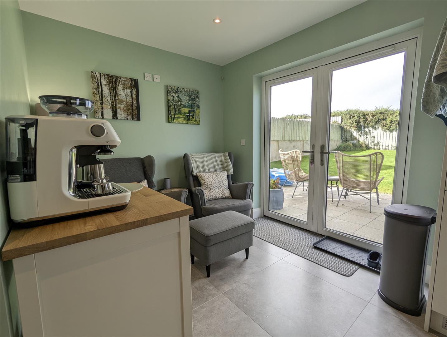 Sitting area leads off to external patio area through glazed French doors. There are also five double sockets and one radiator