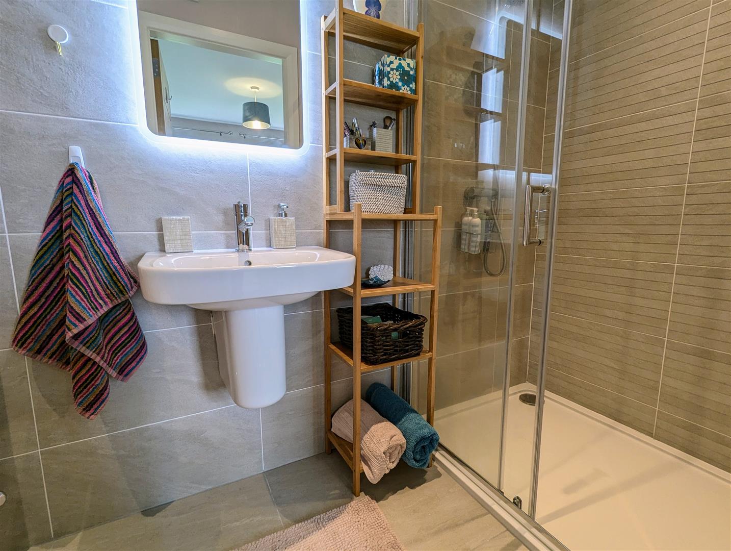 Spacious ensuite featuring a walk in shower with a sliding screen and thermostatic shower. Full height wall tiling throughout and modern paint colours to match bedroom. WC, wall mounted wash hand basin, heated towel rail, electric mirror and an extractor fan
