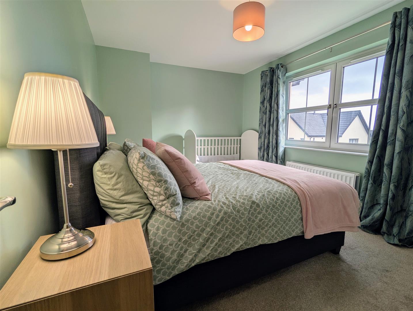 Double bedroom with views towards the fully maintained development green area, pale green wall colours, neutral coloured carpet, three double sockets, one radiator