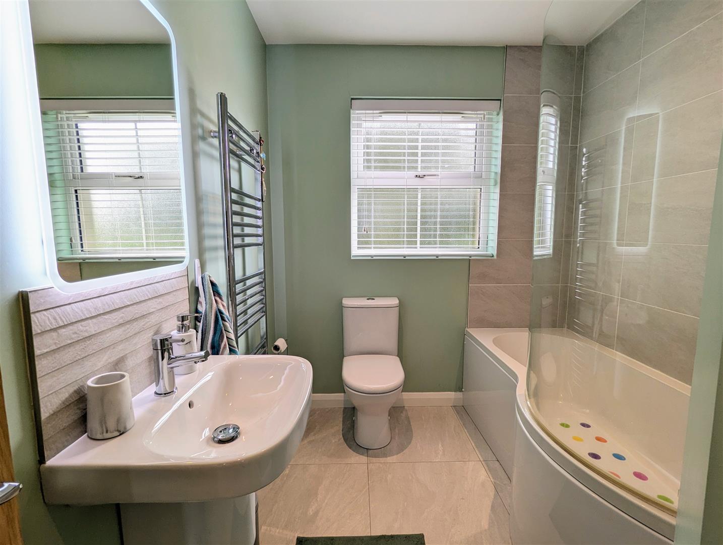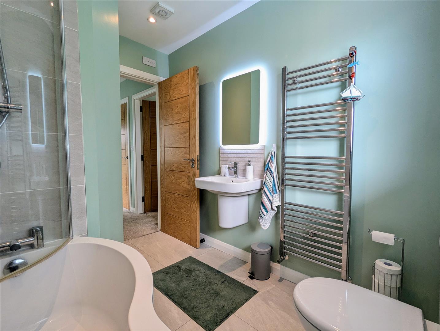 Main bathroom featuring a panel bath with a fully tiled splashback, thermostatic shower and a pivot screen. Ceramic floor tiles, wall mounted basin with tiled splash back and electric mirror. Chrome heated towel rail, extractor fan, spotlights and a low flush WC