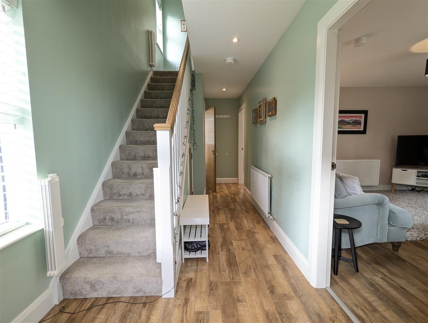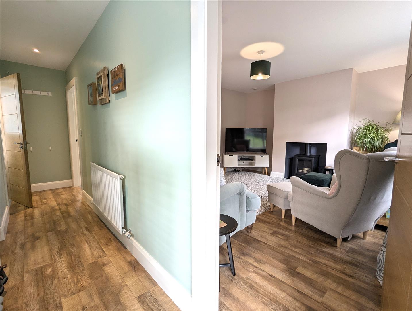 Green composite door with glazed insert and side panel opening up to a hallway providing access to ground floor rooms and staircase. Oak effect laminated wood flooring throughout, pale green wall colours, recessed down lights, one double socket, one radiator, under stair store cupboard, provision for an intruder alarmr alarm