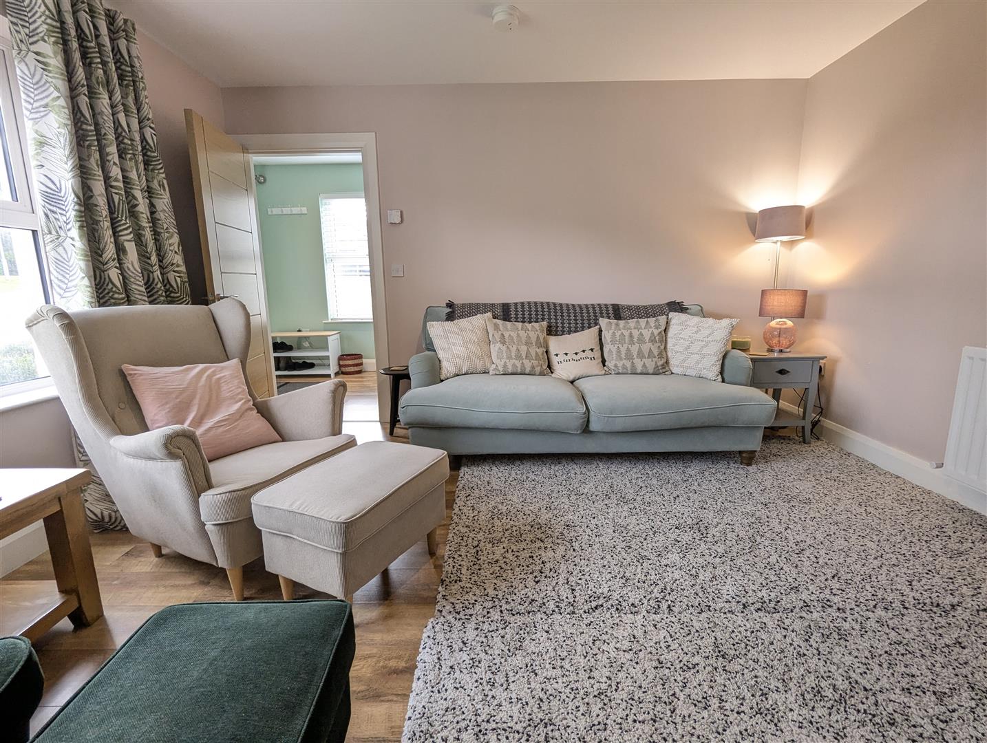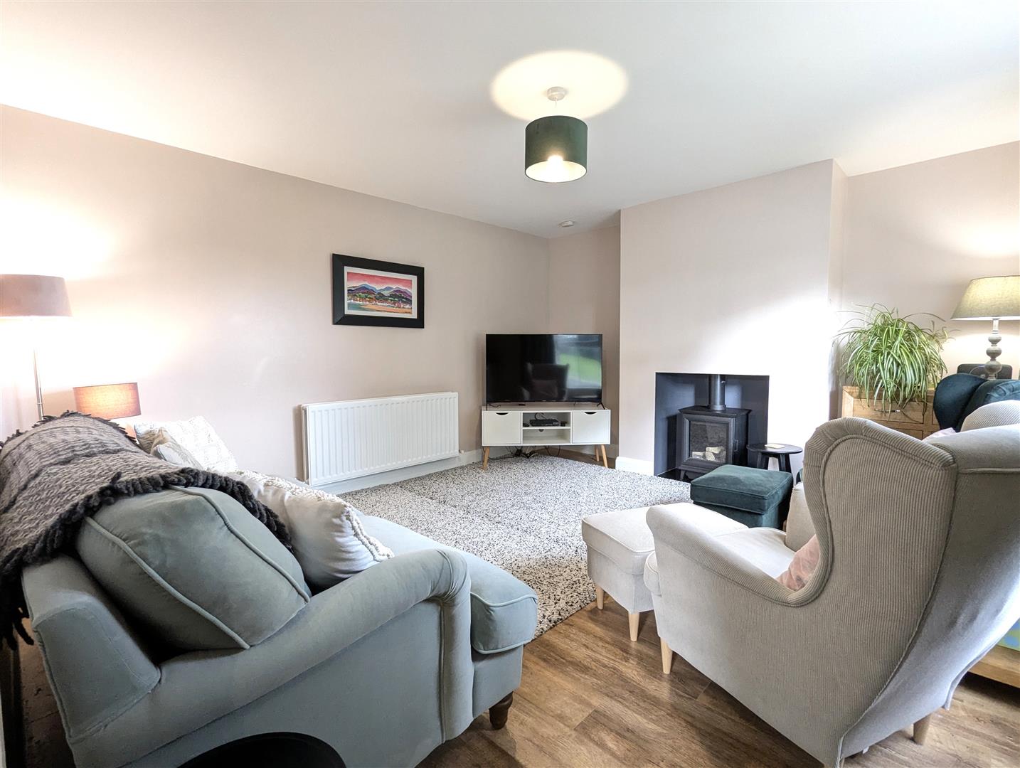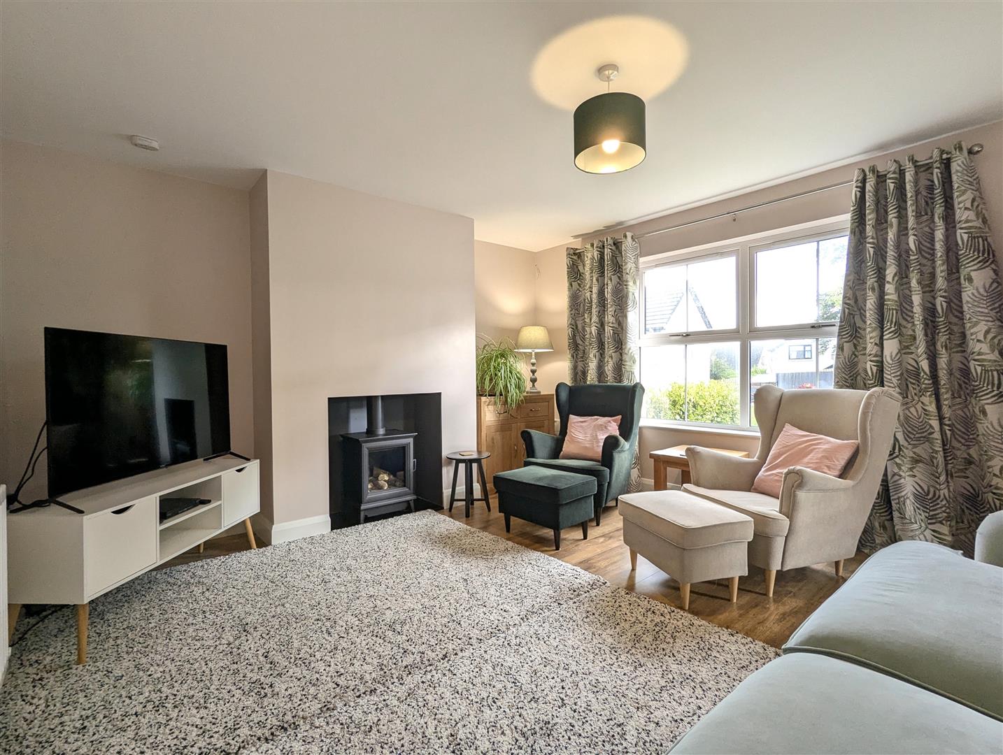 Oak door leads to a bright living room with contemporary paint colours and views of the front garden and the communal green space. Further features include an inset Gazco gas stove on a granite hearth, laminated wood flooring, thermostat controls, four double sockets and one radiator