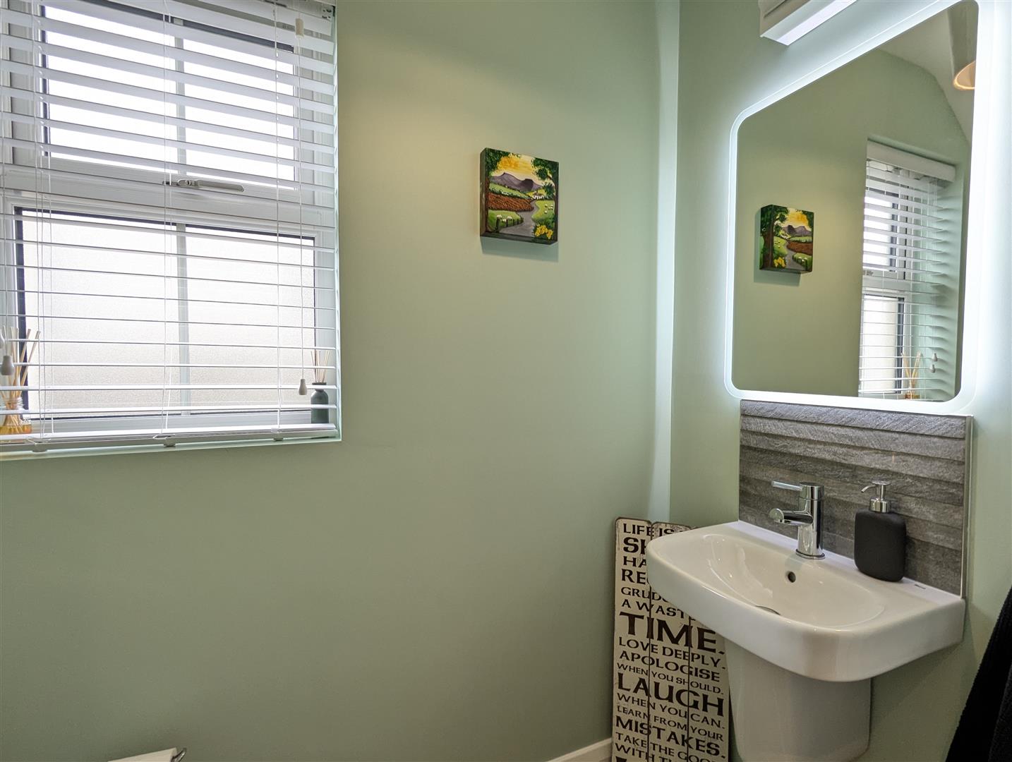 Ground floor WC with an electric mirror over a wall mounted wash basin with a decorative tile splash back, WC, laminated wood flooring, radiator