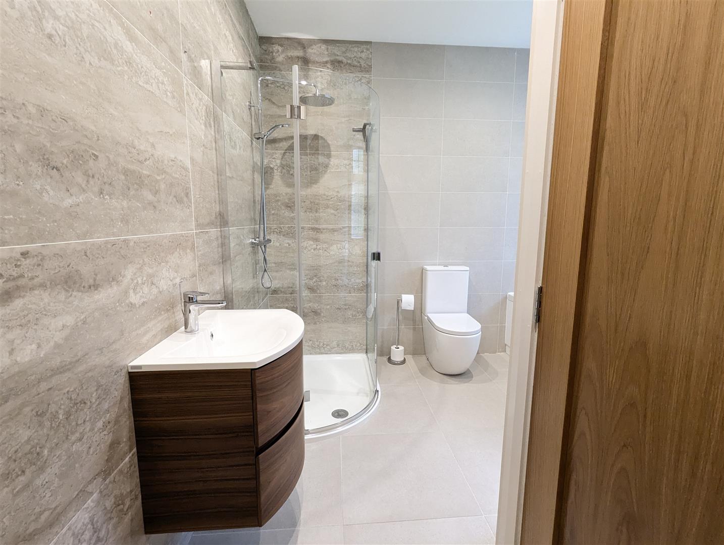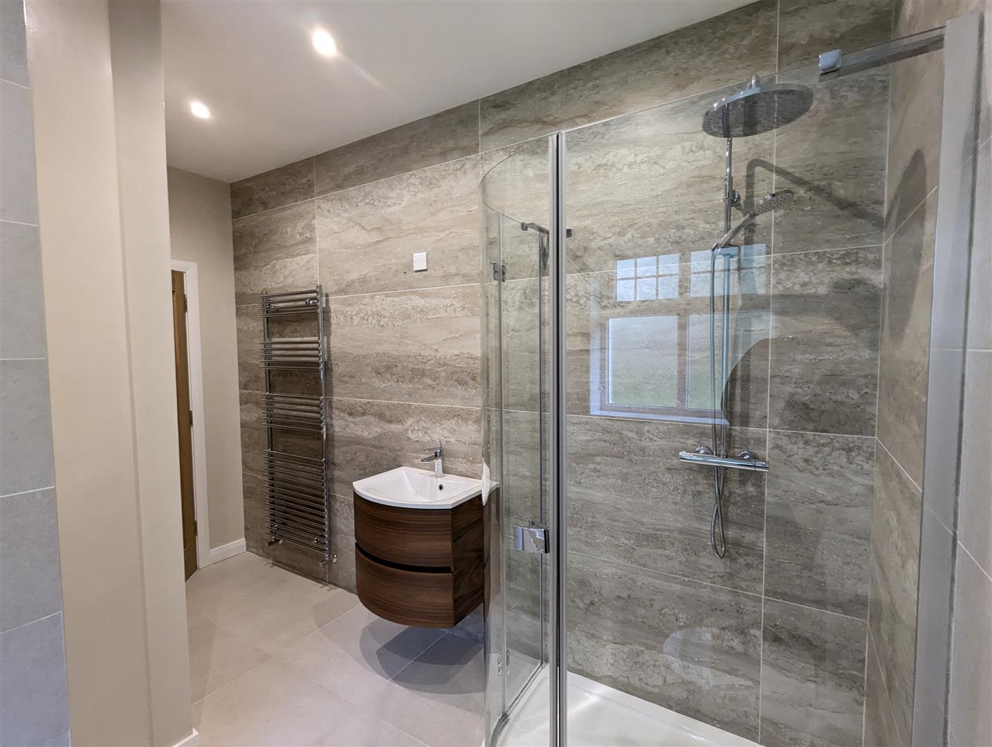 Tiled floor, full height wall tiling with decorative border, panel bath with mixer tap, back to wall W.C, floating dark wood vanity unit, corner shower enclosure with rain fall shower head and handset, polished chrome heated towel rail, extractor fan, recessed spot lighting