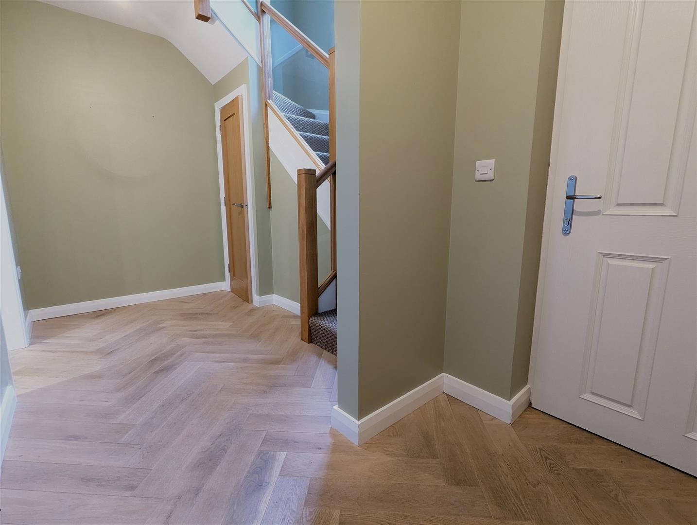 Composite front door leading to an entrance hall with Herringbone style white oak flooring, access provided to W.C, cloakroom, kitchen and staircase