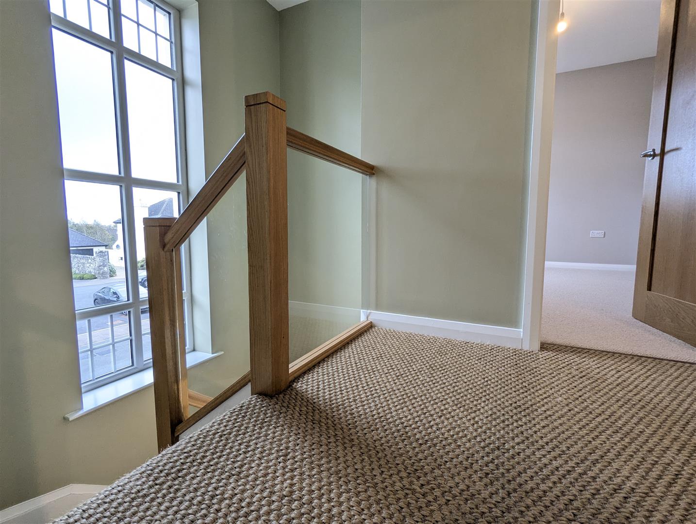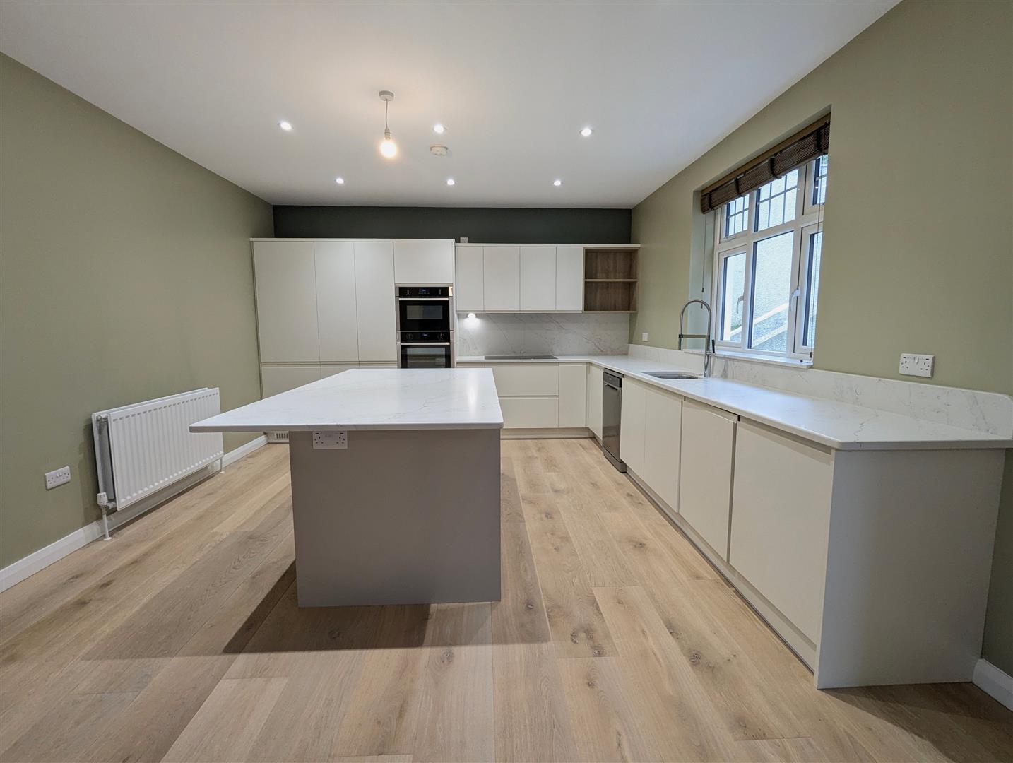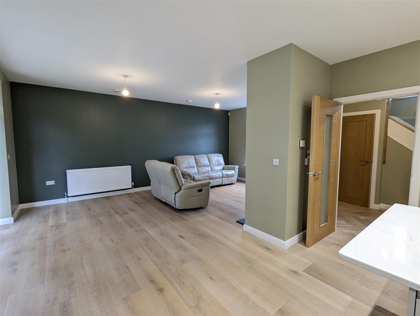 Open plan to living area, hardwood flooring throughout, recessed spot lighting, feature walls of `cooking apple“ and `green smoke“ green. High and low level handleless units with pull out shelving, x5 ring induction hob, concealed overhead extractor, Calcutta gold quartz counter tops, recess and plumbing for dishwasher and washer/dryer, 1.5 bowl sink. Island with recess for seating, additional handle-less units, matching quartz countertops. X6 double sockets and concealed fuse switches, T.V point, x 2 radiators