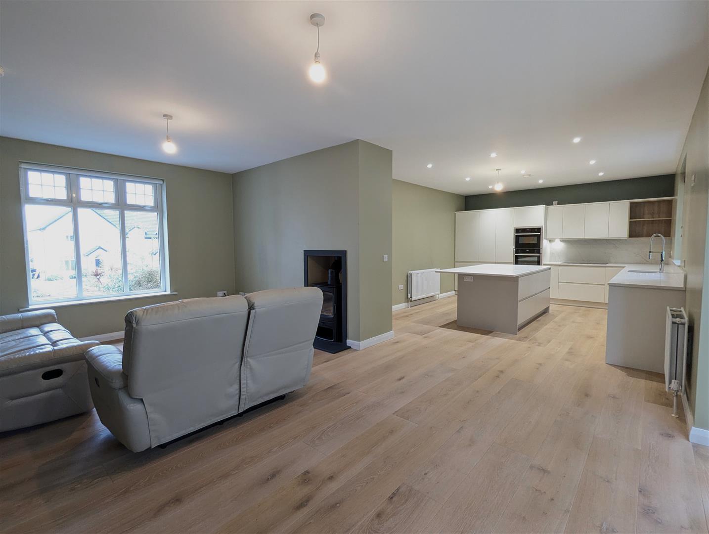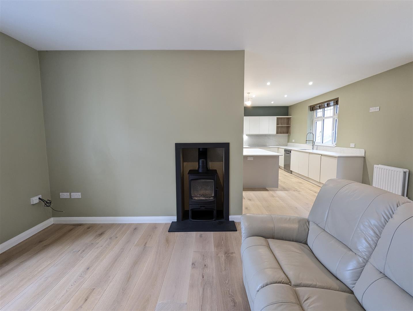 Dual aspect room, open plan to kitchen, hardwood flooring continued from kitchen. Charnwood Aire 5 Stove with a Skamotec panelled enclosure, stone hearth, x4 sockets, T.V point, radiator