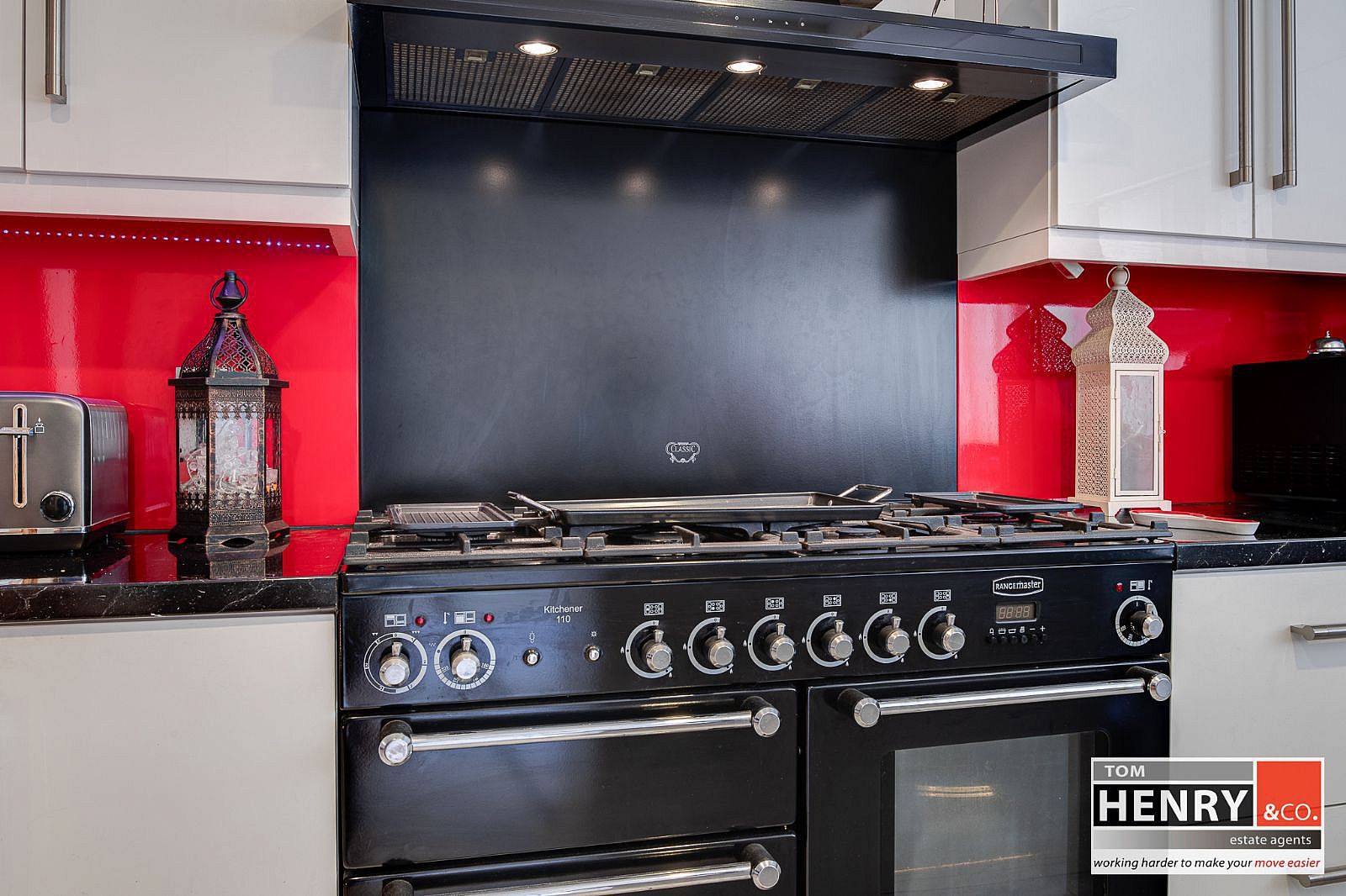 OPEN FROM SITTING ROOM. FITTED HIGH & LOW LEVEL UNITS. FEATURE KICKBOARD LIGHTING. ISLAND UNIT. S.S. SINK & DRAINER WITH MIXER TAP FITTING. “RANGEMASTER” RANGE WITH GAS HOB & ELECTRIC OVEN WITH X-FAN OVER. INTEGRATED FRIDGE. INTEGRATED FREEZER. TILED FLOOR.