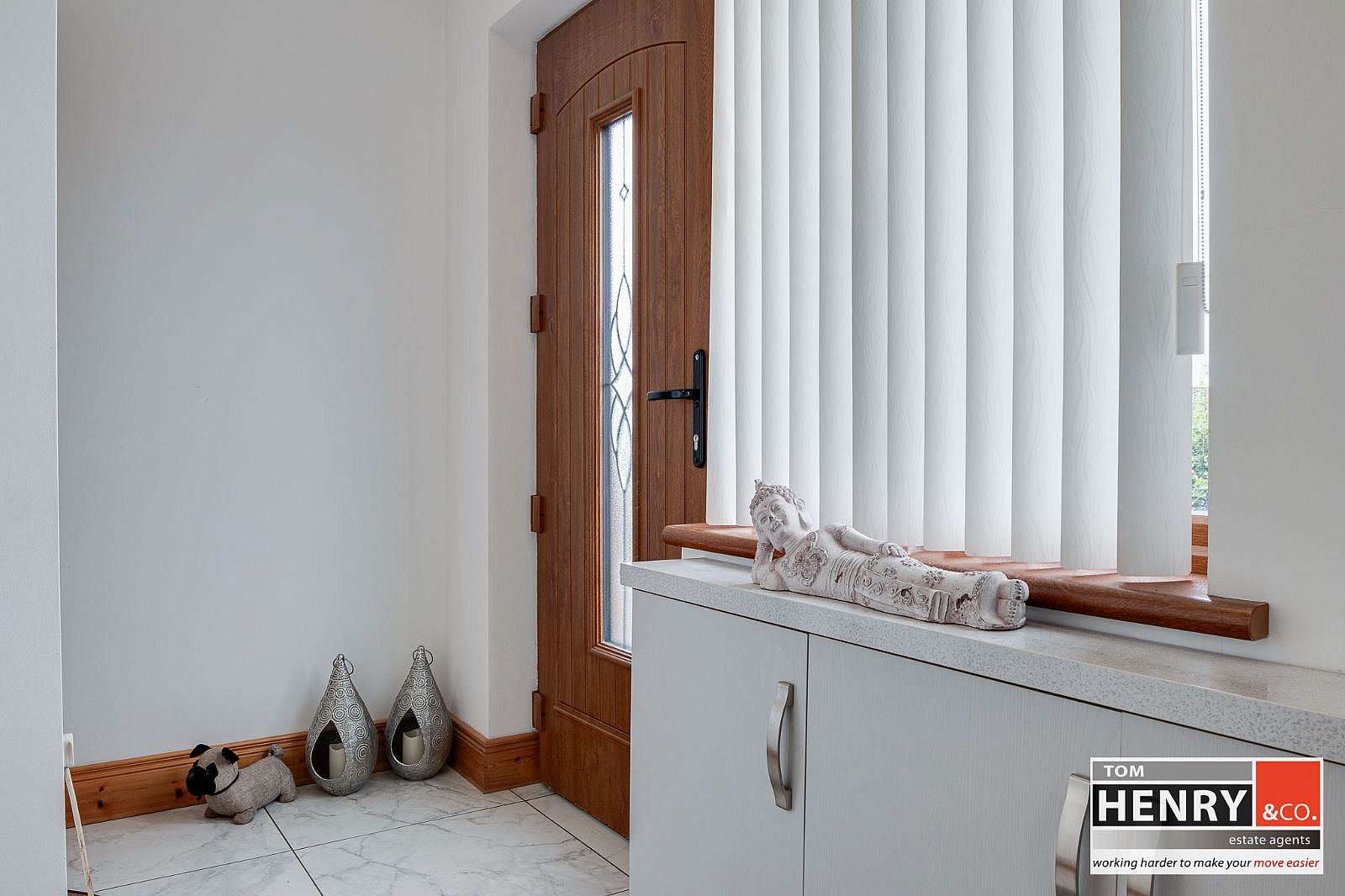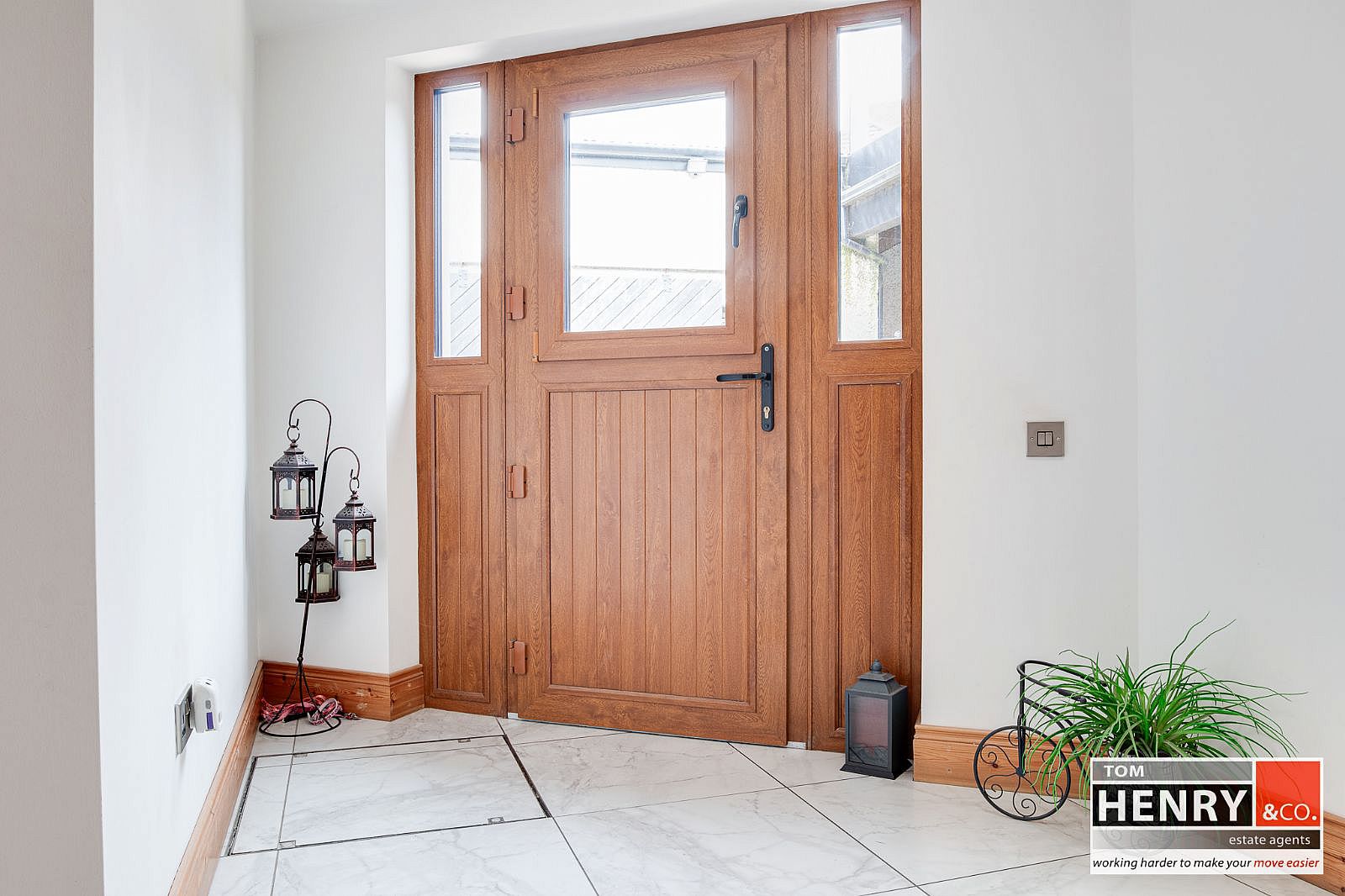 U.P.V.C. EXTERNAL DOOR WITH LEADED GLAZED PANEL. TILED FLOOR.