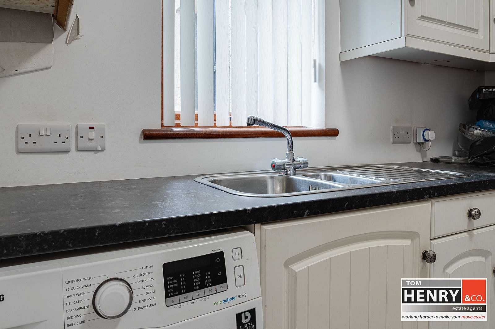 FITTED HIGH & LOW LEVEL UNITS. PLUMBED FOR WASHER / DRYER. S.S. SINK & DRAINER WITH MIXER TAP FITTING. TILED FLOOR. OIL FIRED BURNER. X-FAN.