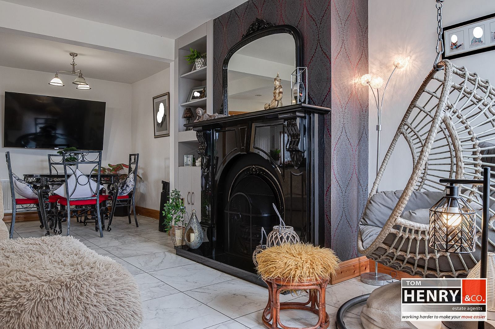 OPEN FIREPLACE WITH H.O.B.B. DISPLAY SHELVING. TILED FLOOR. OPEN TO KITCHEN / FAMILY DINING AREA.