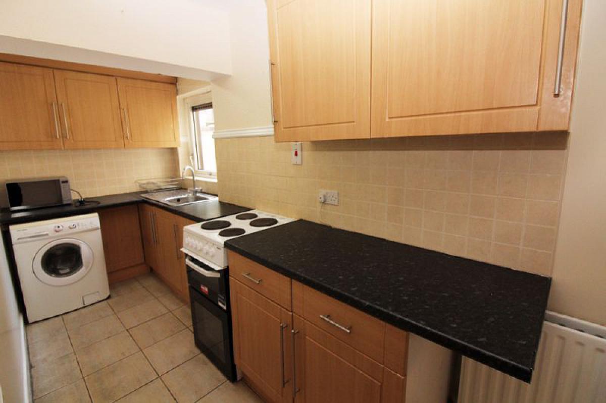 Range of high and low level kitchen units including cooker, washing machine and fridge. Fully tiled floor and part tiled walls. Single drainer sink unit. Store off.