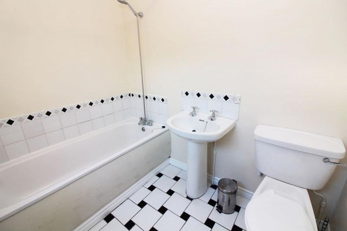 White bath, toilet and wash hand basin. Fully tiled floor and part tiled wall.