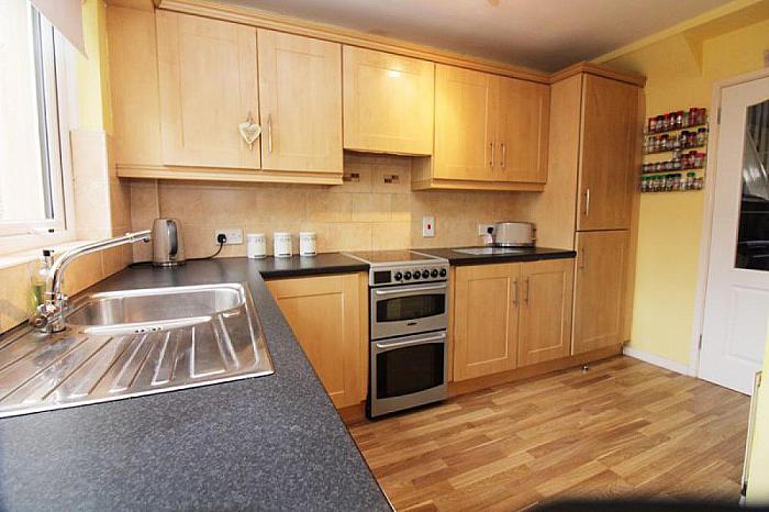 Extensive range of high and low level units including cooker and fridgefreezer. Plumbed for washing machine and laminate floor. Part tiled walls. Dining area off.