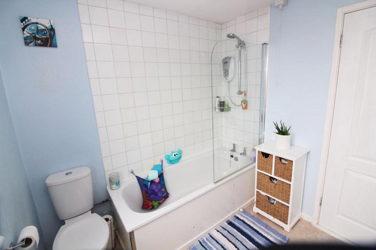 White bath with electric shower over and fitted screen, toilet and wash hand basin. Part tiled walls.