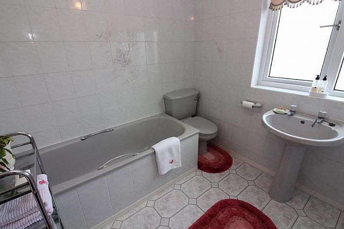 Coloured bath, toilet and wash hand basin. Fully tiled walls and floor.