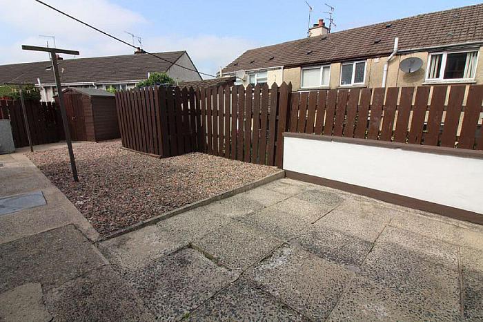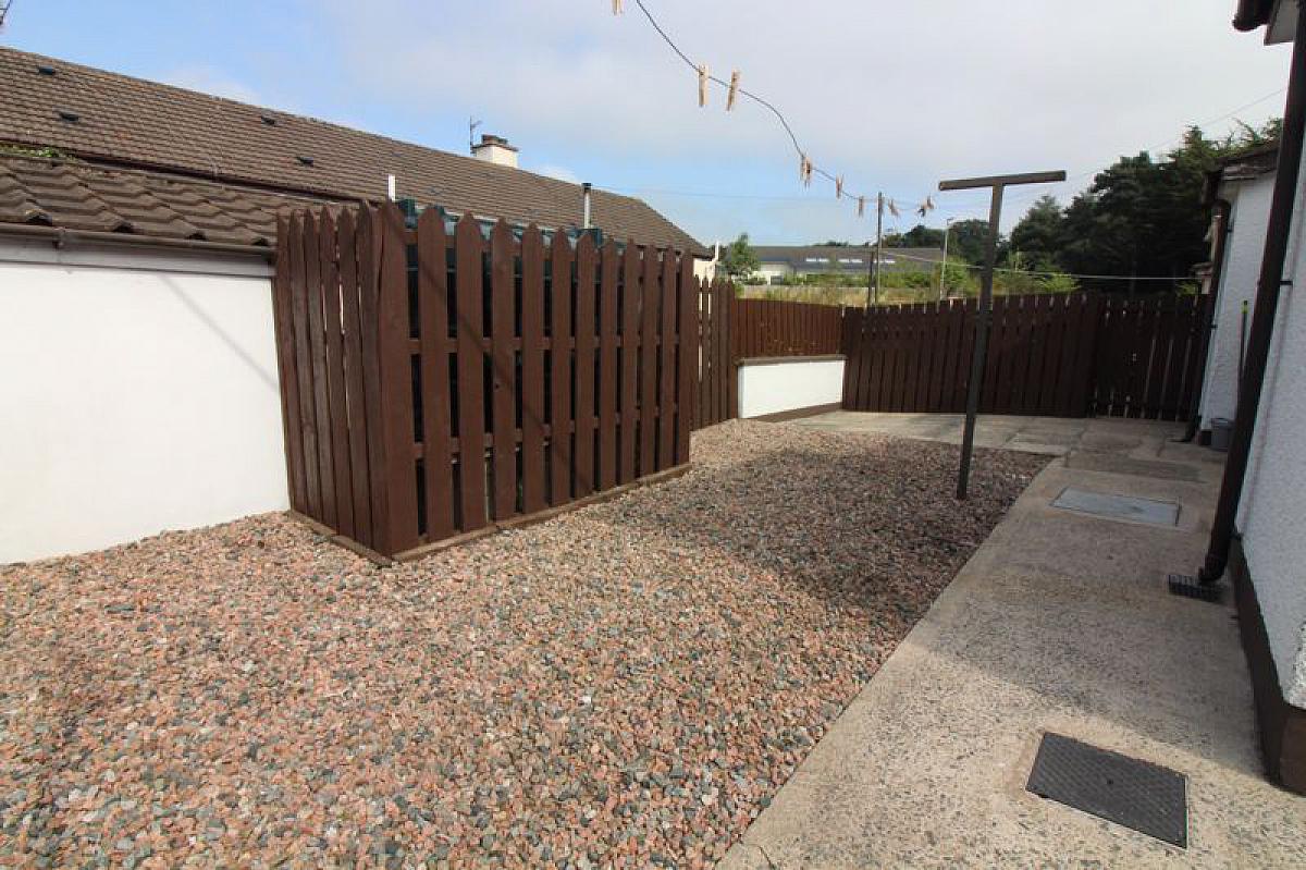 Block wall with wrought iron gate to front. Feature paved and stoned area. Outside light, side entrance to rear. Flagged patio and pink pebble area to rear. Outside light and clothesline. Garden shed included.