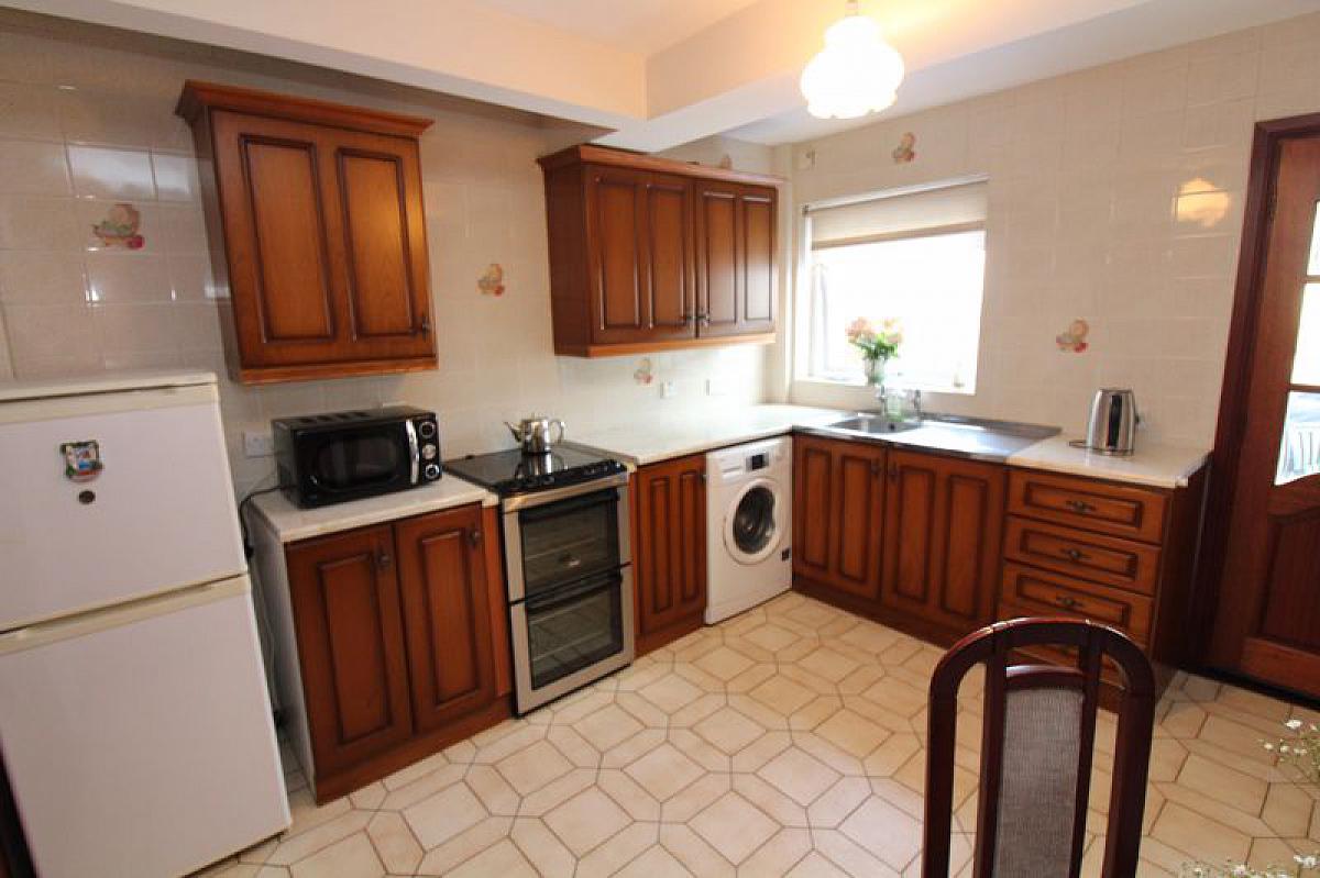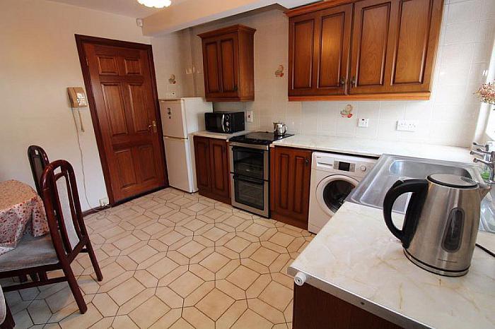 Range of fitted high and low level units with cooker, washing machine and fridge-freezer. Fully tiled floor and part tiled walls, telephone point.