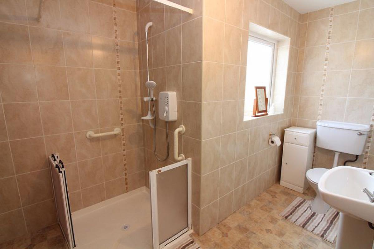 Walk in electric shower, toilet and wash hand basin, fully tiled walls.