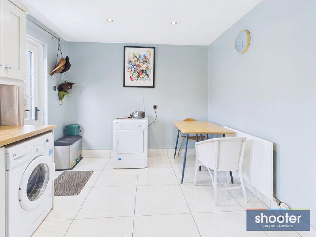 Modern and low level units incorporating 1 1/2 stainless steel sink unit, integrated oven, touch hob, fridge-freezer, dishwasher and space for washing machine. Recessed ceiling lights. Ceramic tile floor and part tiled walls. PVC door to rear.