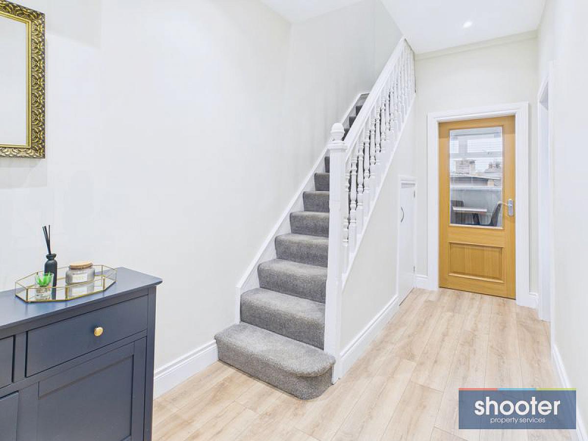 PVC door. Understairs storage and recessed ceiling lights. Laminate floor.