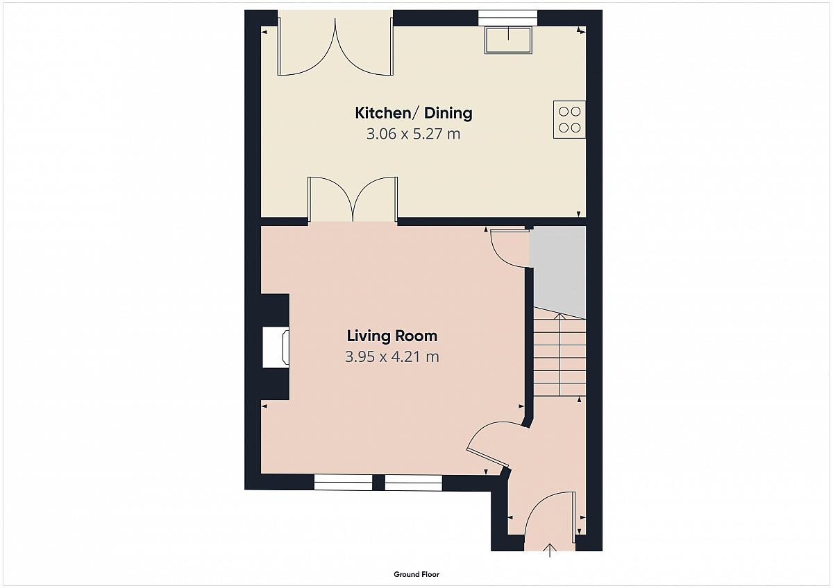 Open fire with tiled hearth. Television aerial. Double doors leading to kitchen. Storage cupboard off and laminate floor