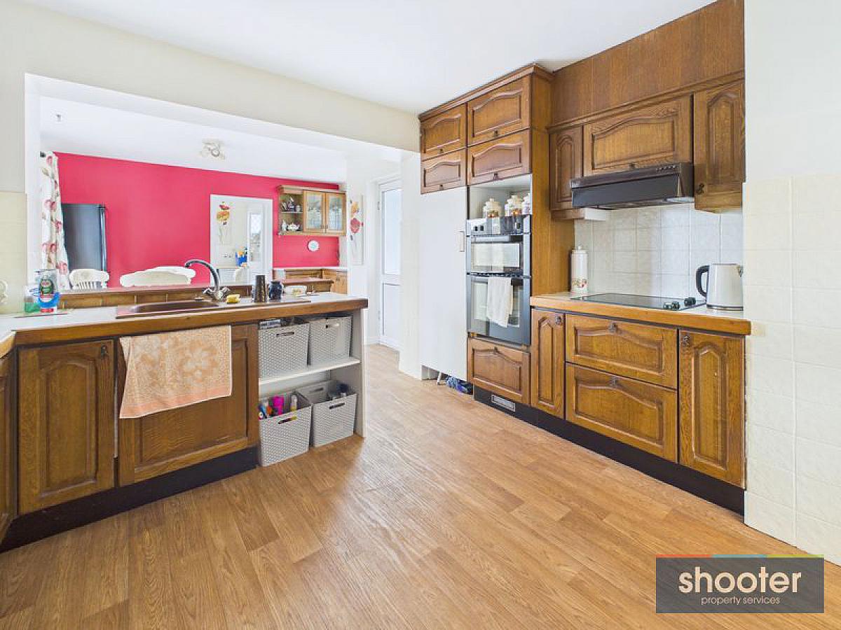 High and low level units with sink unit, fridge-freezer, two floating ovens, hob and extractor fan. Part tiled walls and vinyl floor.