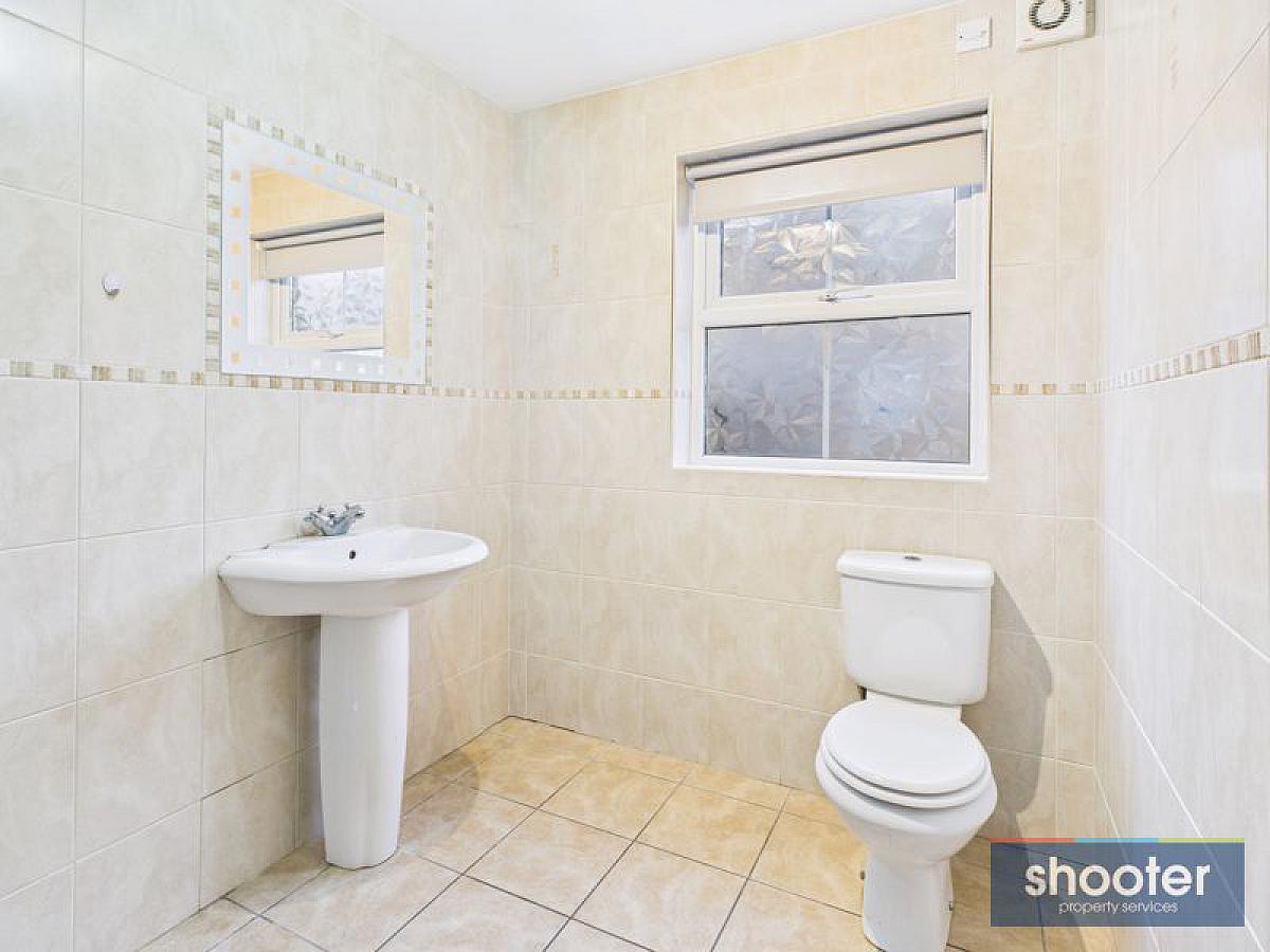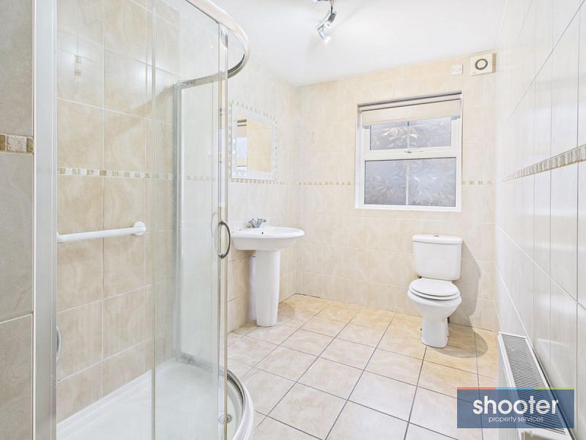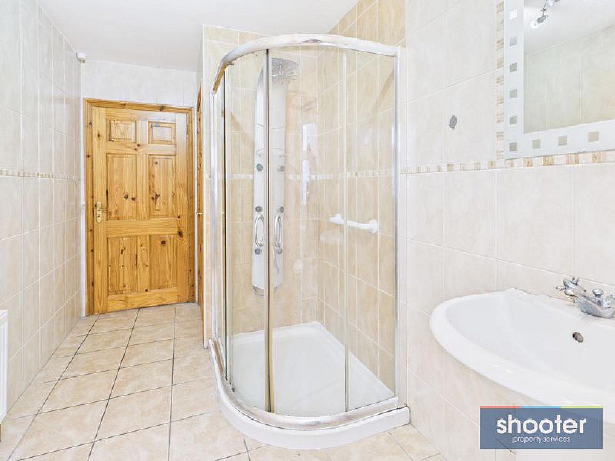 Low flush toilet, pedestal wash hand basin and quad shower unit. Mirror and extractor fan. Fully tiled walls and floor. Hotpress off.