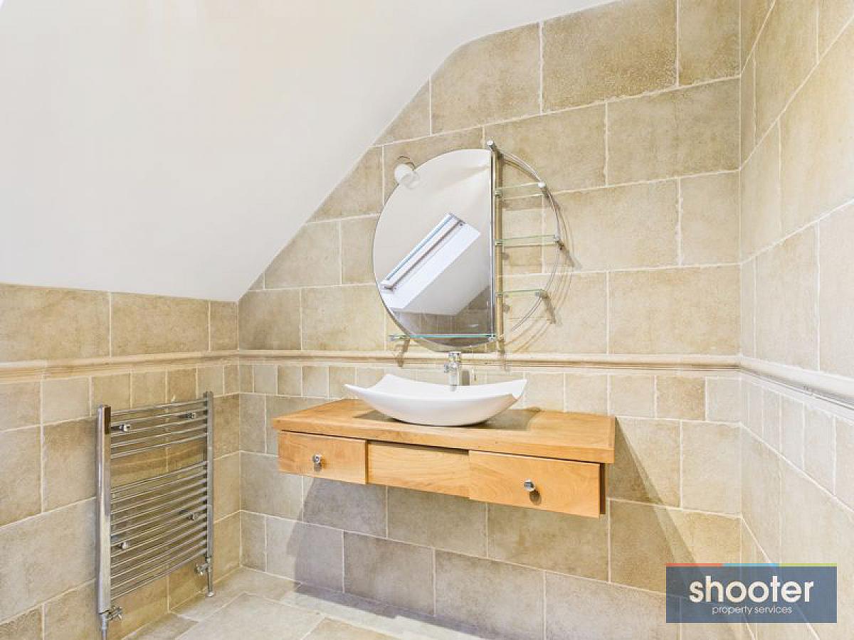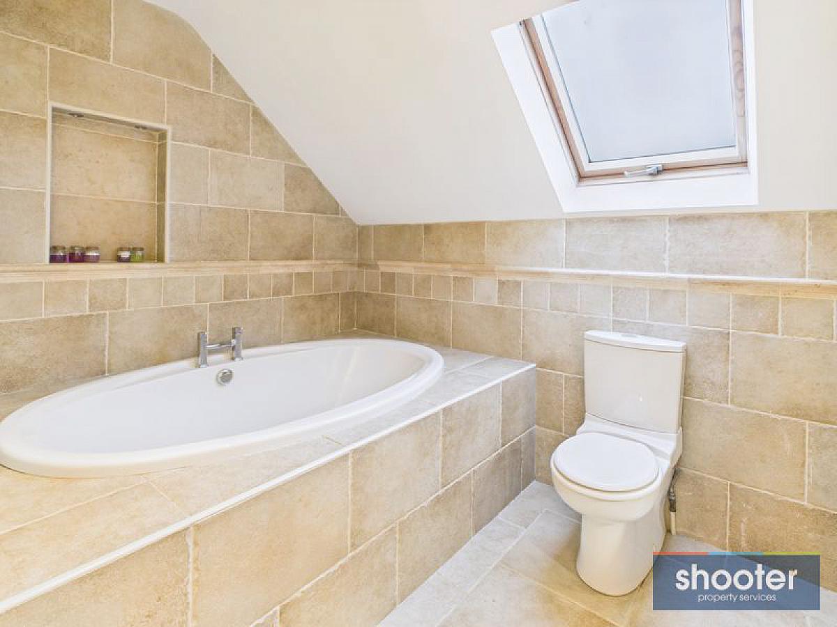 Low flush toilet, tiled bath and hanging vanity unit with wash hand basin. Heated towel rail. Velux window and extractor fan. Fully tiled walls and floor.