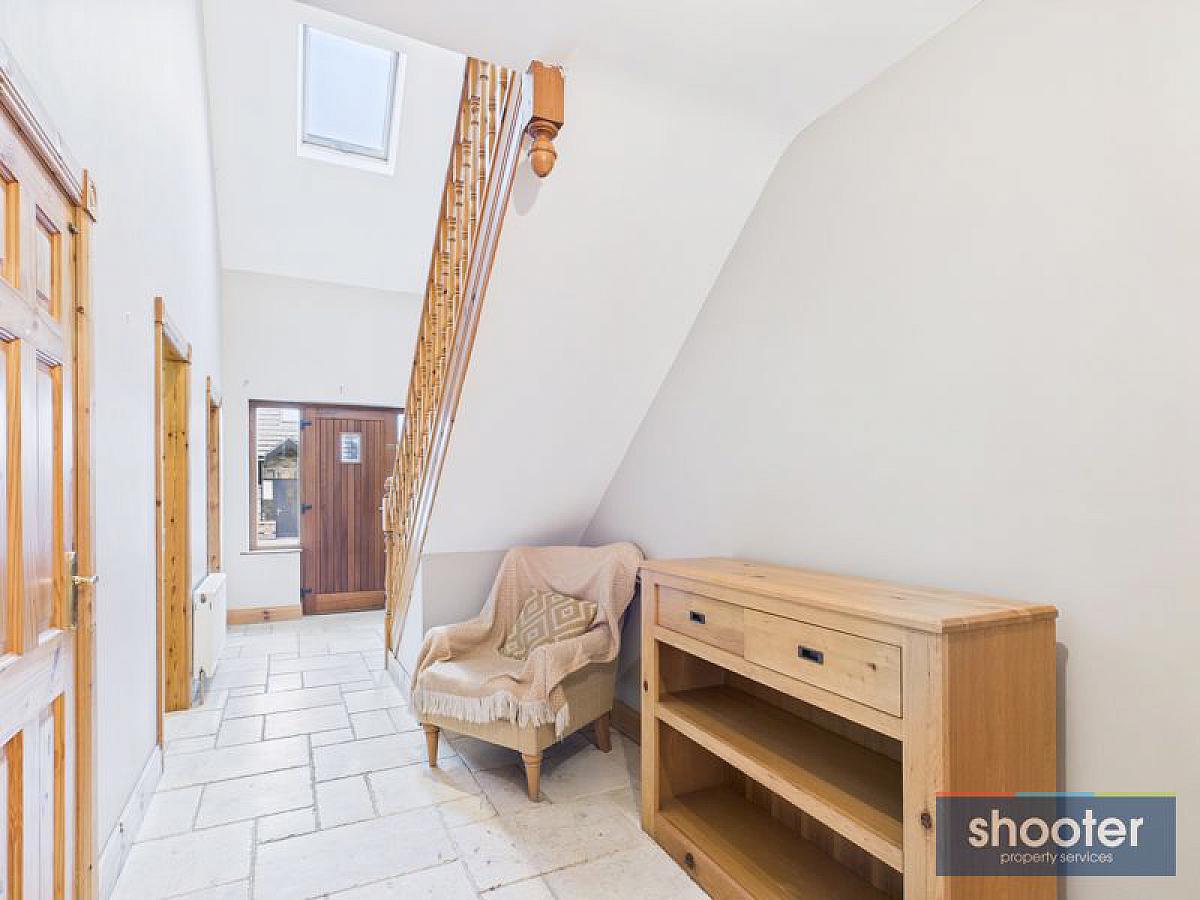 Hardwood door with side screens. Double height ceiling with velux window. Storage cupboard off. Ceramic tile floor.