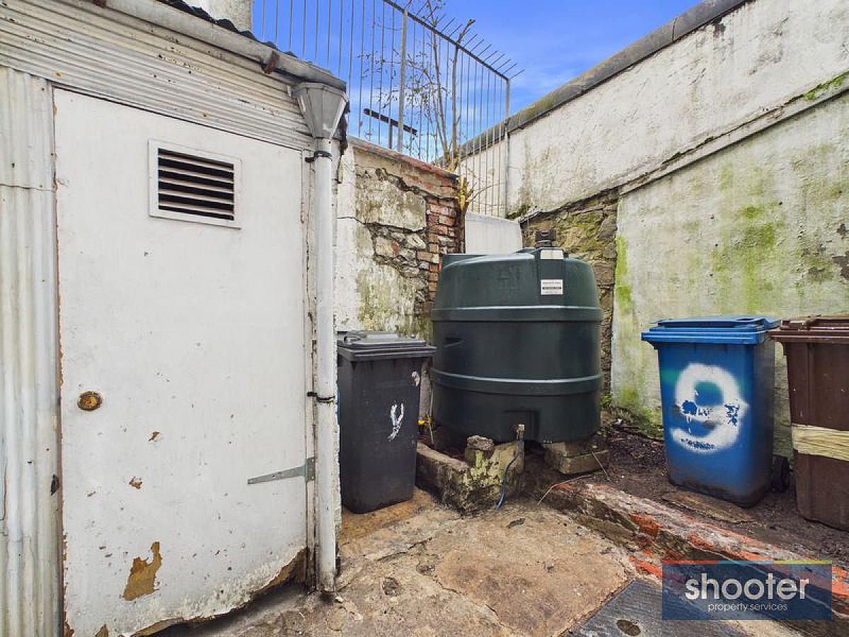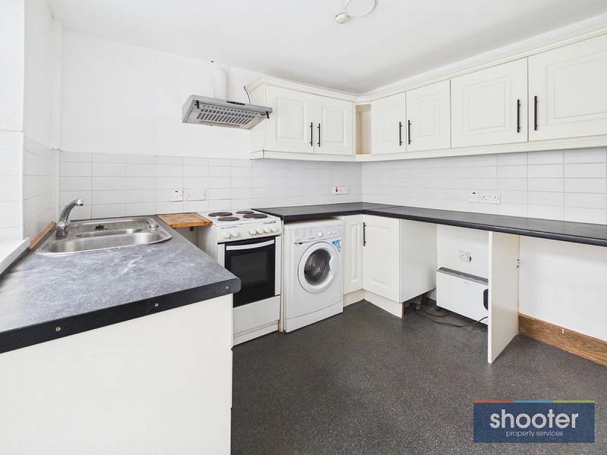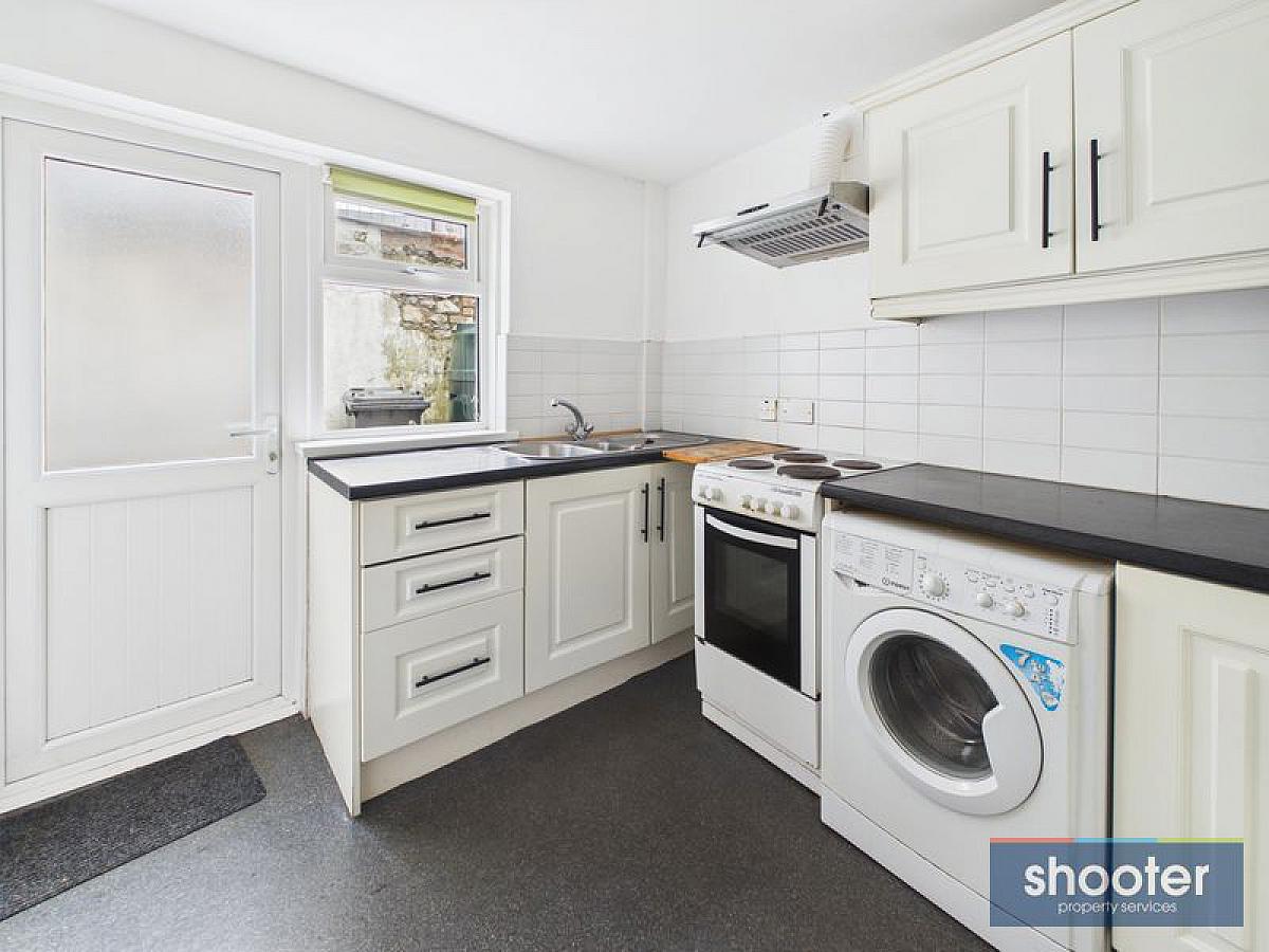 High and low level units, 1 1/2 stainless steel sink unit, cooker, washing machine, electric fan, space for fridge freezer, part tiled walls, vinyl flooring, PVC door leading to rear yard.