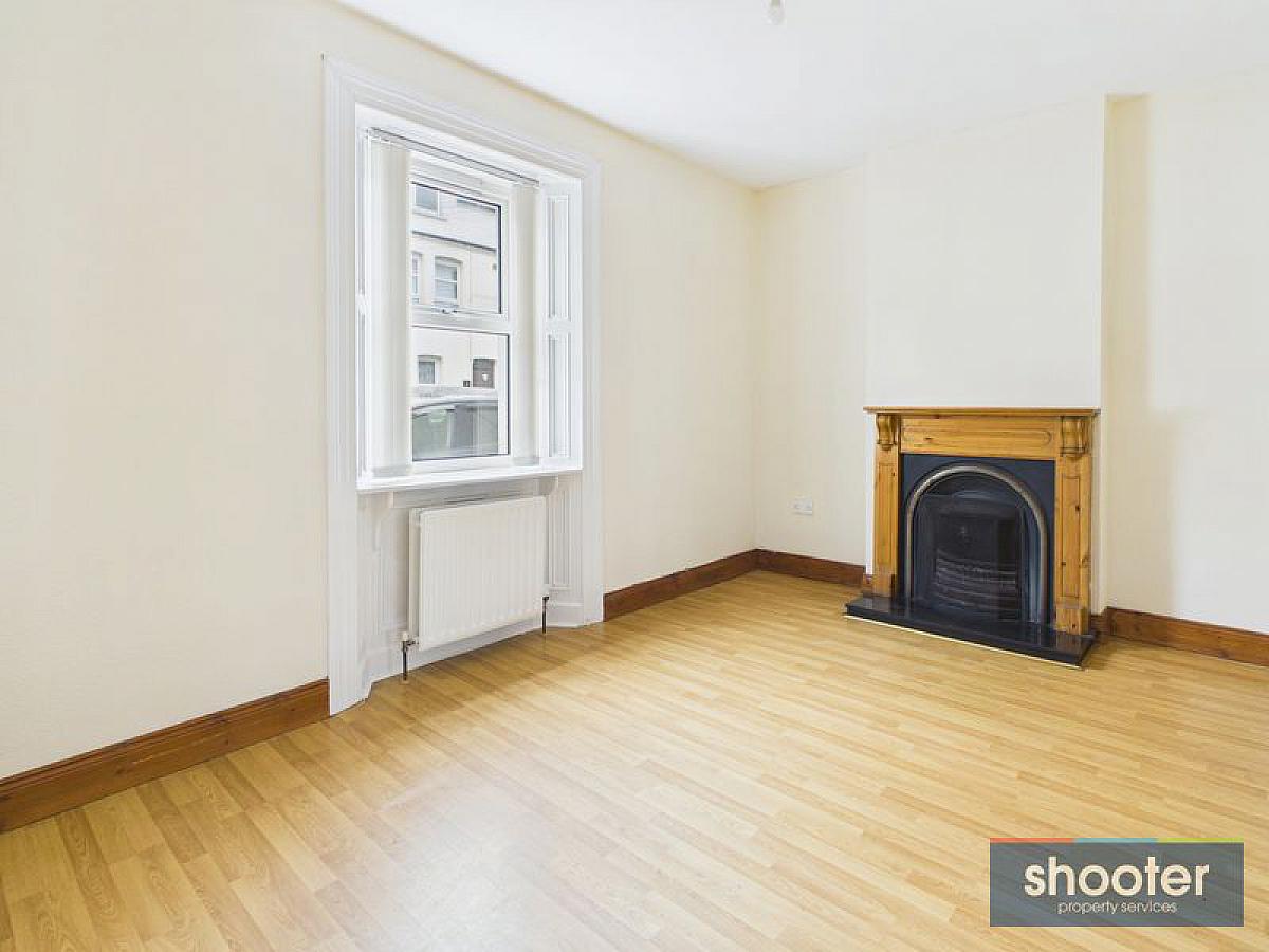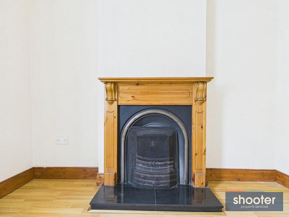 Bay window, open fire, tiled hearth, decorative inset wood surround and mantle. Storage cupboard off. Laminate flooring