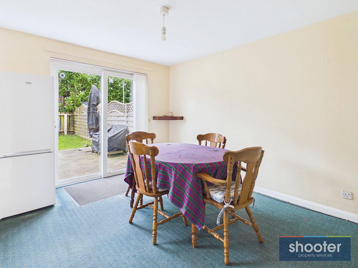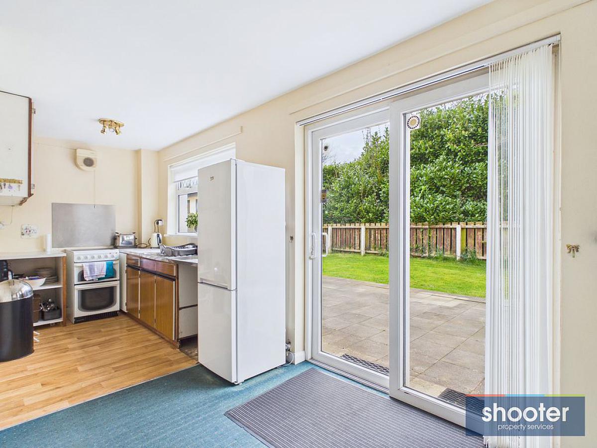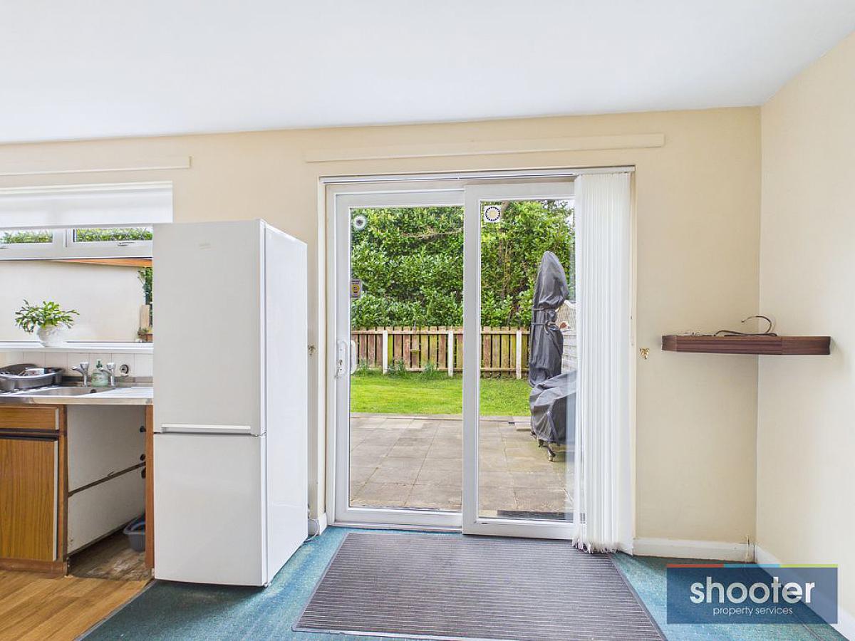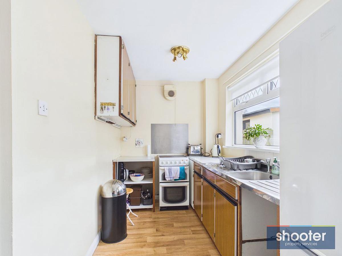 High and low level units incorporating stainless steel sink unit, pantry, free standing cooker, fridge-freezer and space for washing machine. Television aerial and extractor fan. Part carpet and vinyl flooring. Sliding patio door to rear.