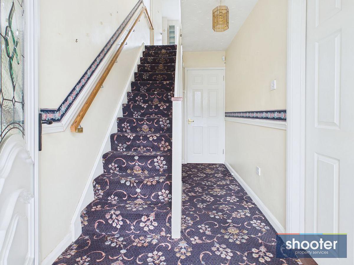 PVC door with decorative glazed side screens, understairs storage and telephone point. Carpet.