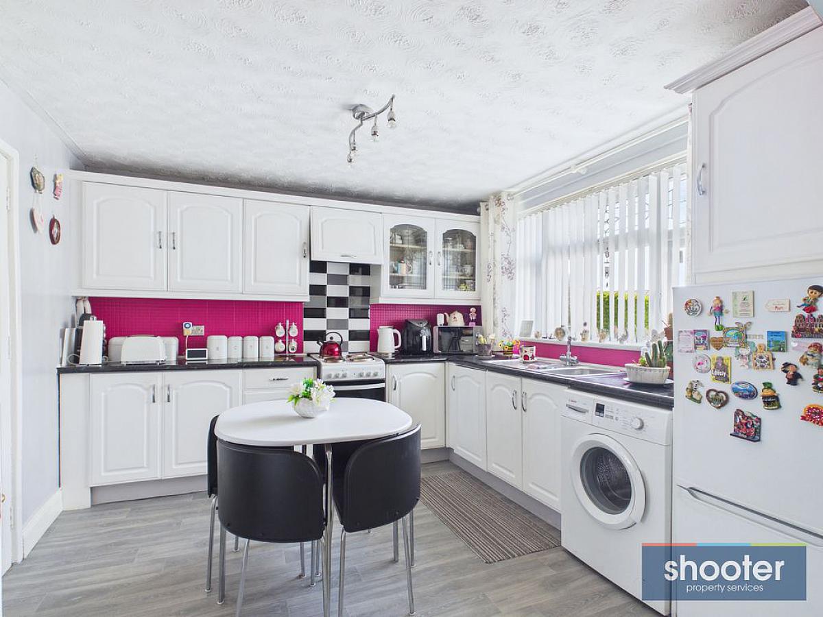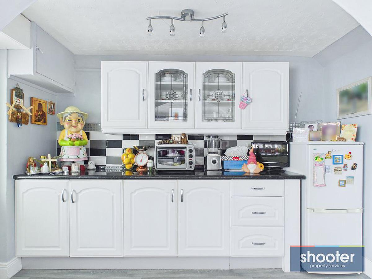 Range of high and low level units. Space for fridge-freezer. Storage cupboard off. Vinyl floor.