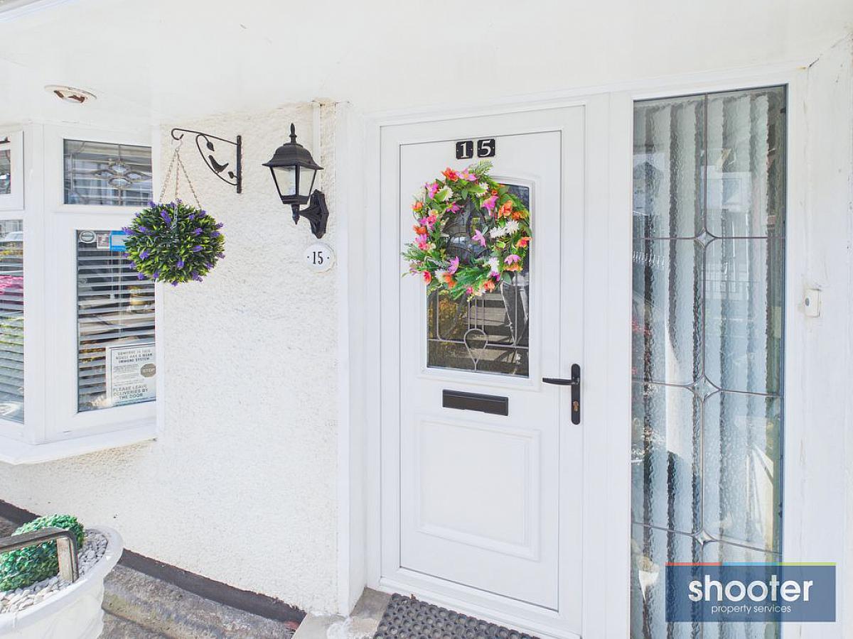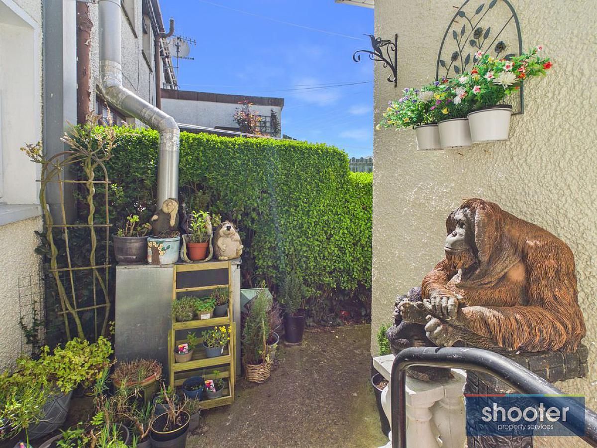 Gate access to neat and tidy front garden. Concrete steps with side rail. Paved patio area with decorative stone flower beds and an array of mature shrubs. Fully enclosed rear garden. Two concrete patio's and path. Outside light and watertap.