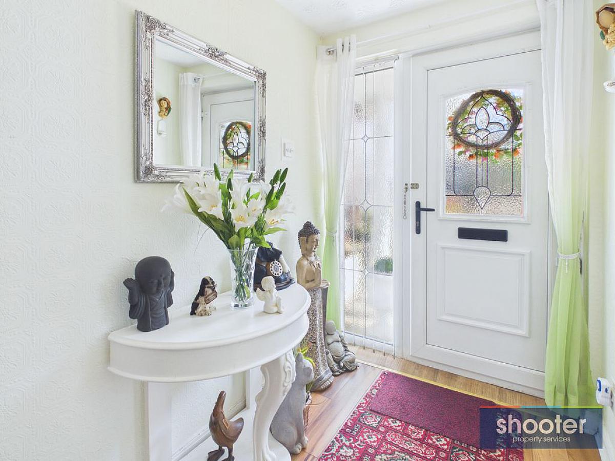 PVC door with glazed side screen and understairs storage. Laminate floor.